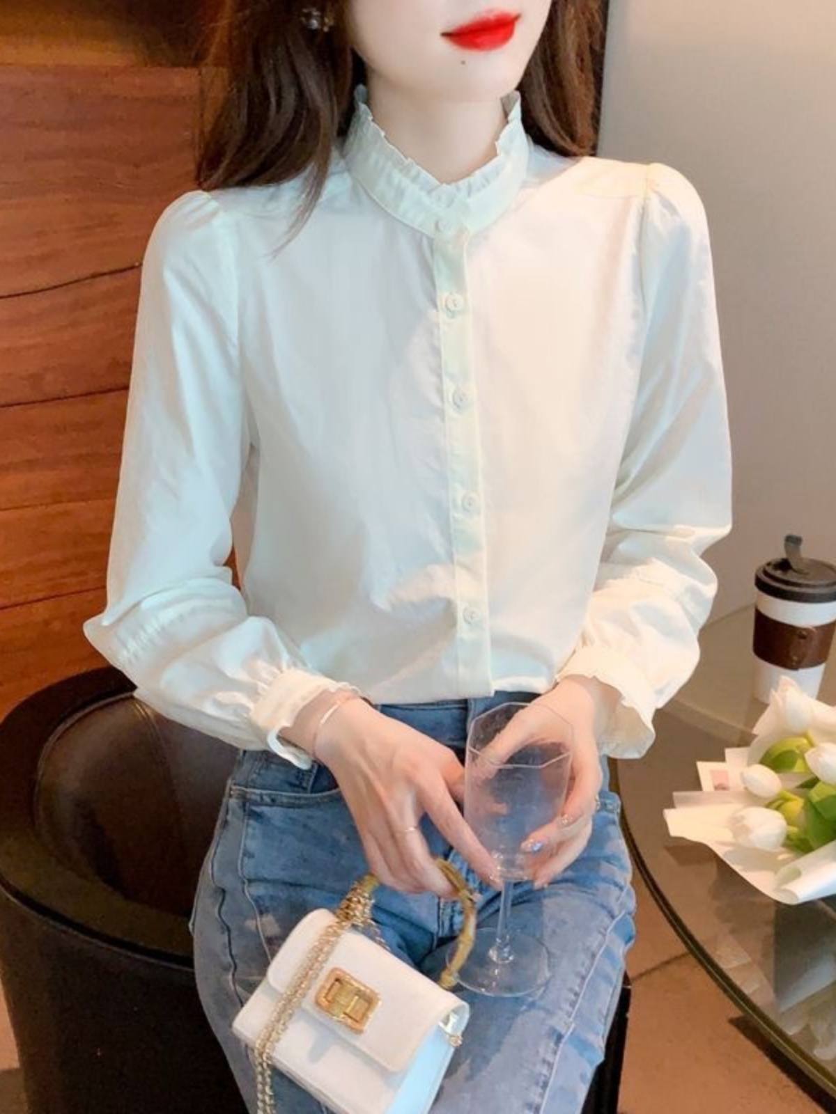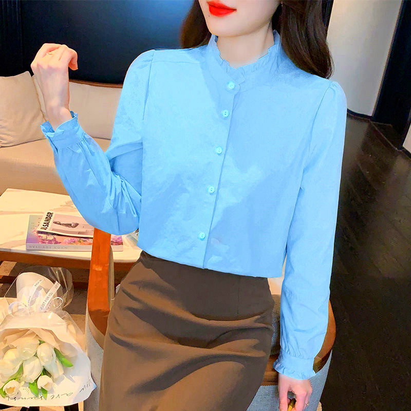 📚 衬衣女款2026新款爆款花边衬衫外衣套打底衫洋气立领鹅淡黄嫩上衣