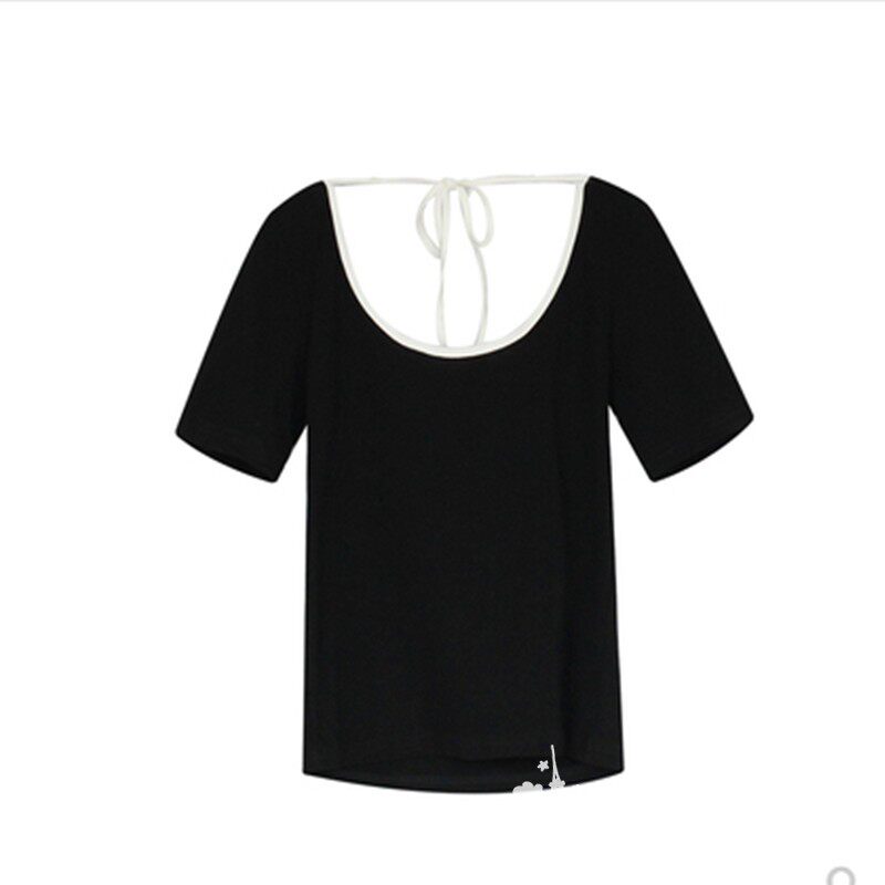 📚 夏新款修身显瘦露背短袖T恤女后背系带圆领百搭上衣复古撞色小衫