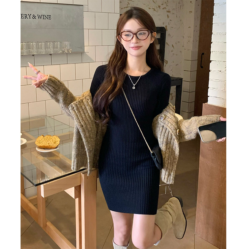📚 圆领针织连衣裙气质春季短款配大衣的内搭修身包臀打底毛衣裙短裙