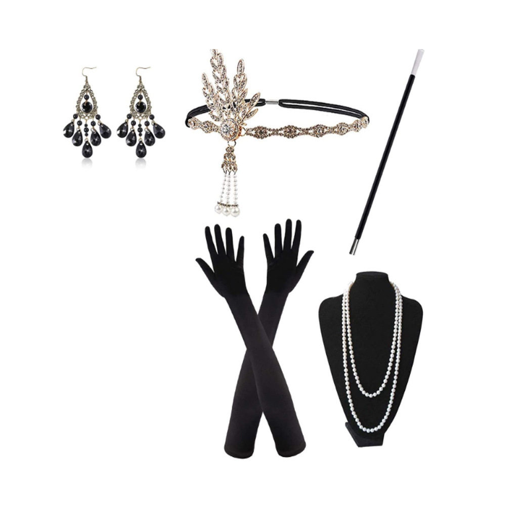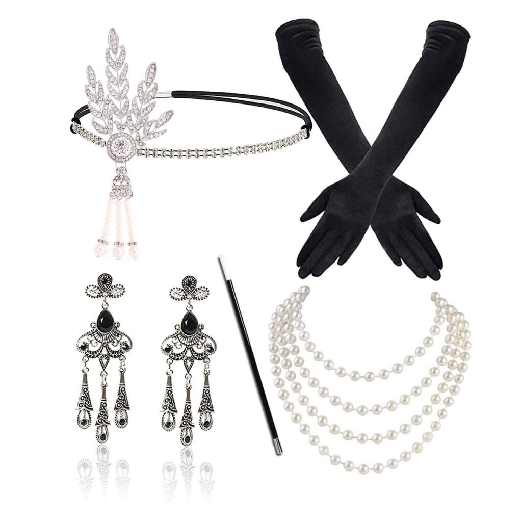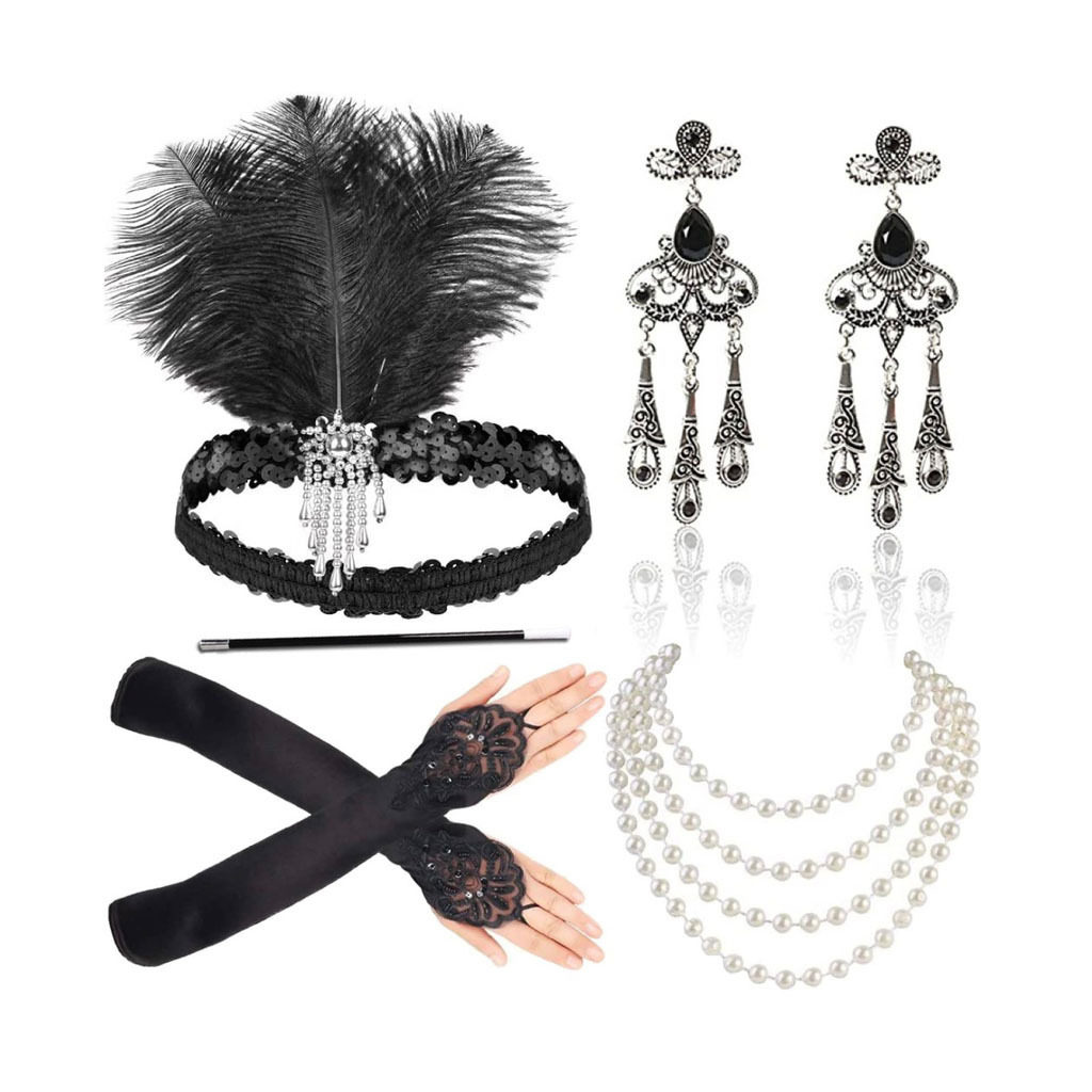 📚 盖茨比派对羽毛合金头带珍珠项链烟杆手套套装复古赫本装扮配饰