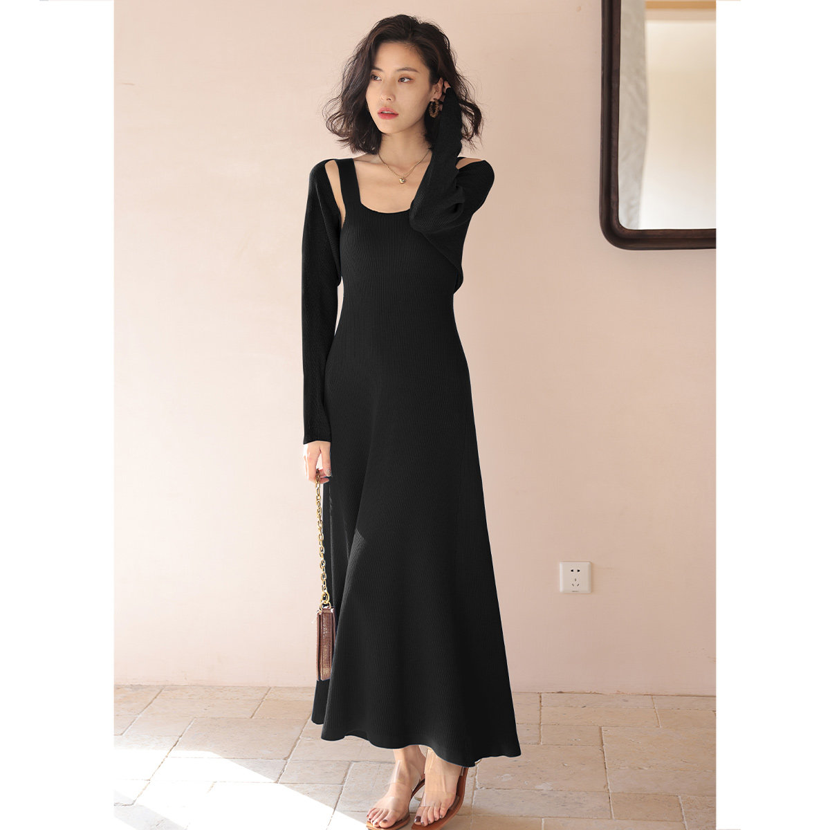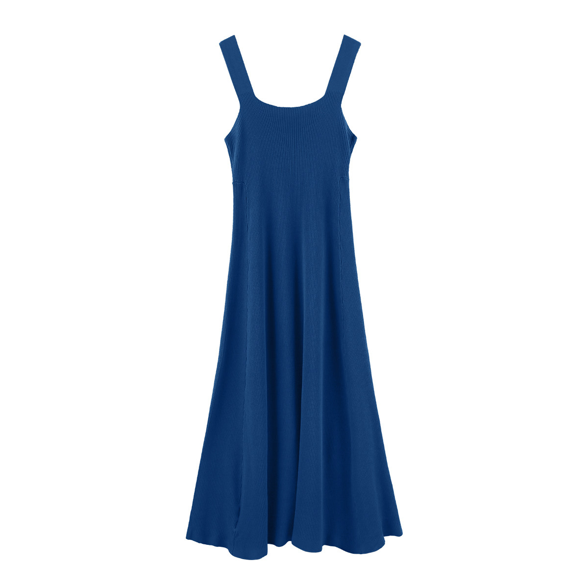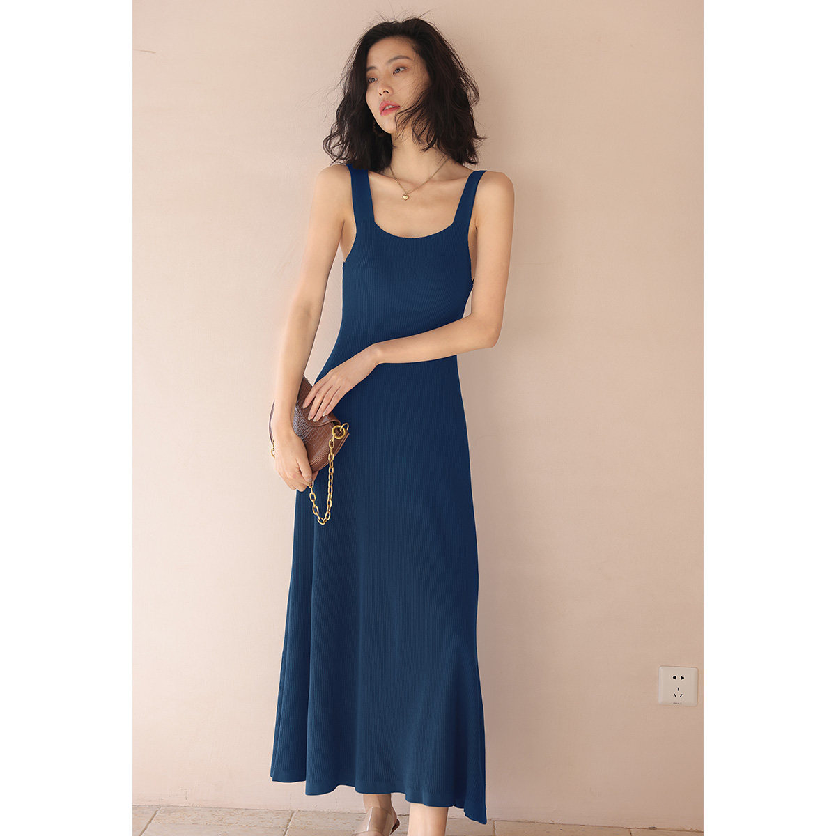 📚 弥古蓝色吊带连衣裙女夏季冰丝针织长裙修身法式度假黑色打底裙子