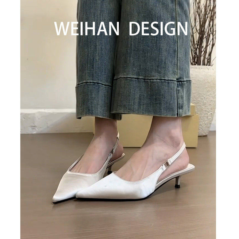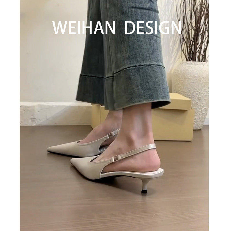 📚 羊皮版!法式低跟包头凉鞋女夏尖头细跟浅口高跟鞋仙女风绸缎单鞋