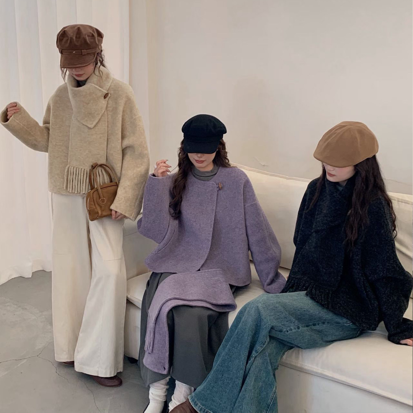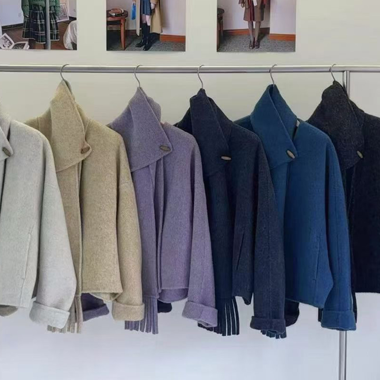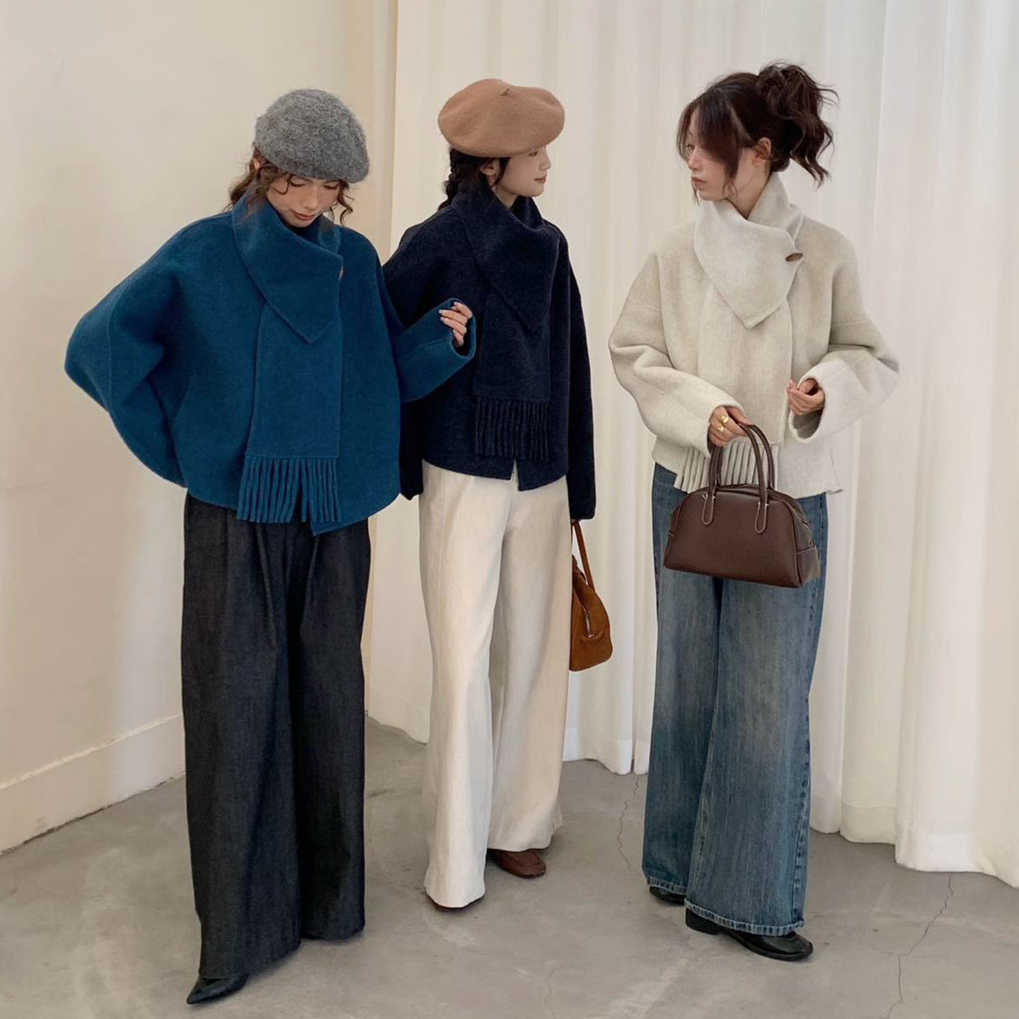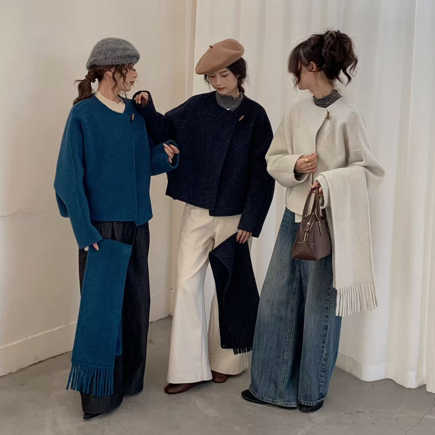 📚 流苏围巾款双面羊绒大衣女2025秋冬新款韩版小个子短款羊毛呢外套