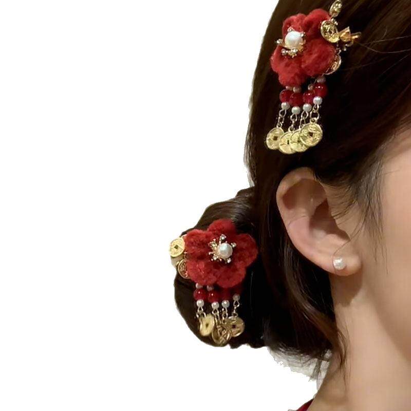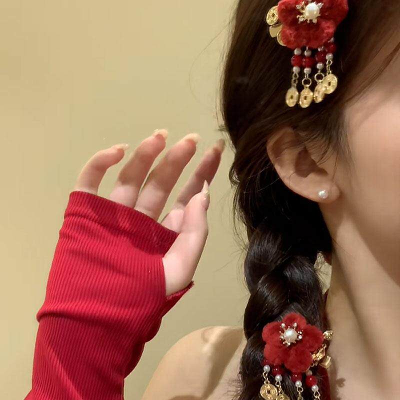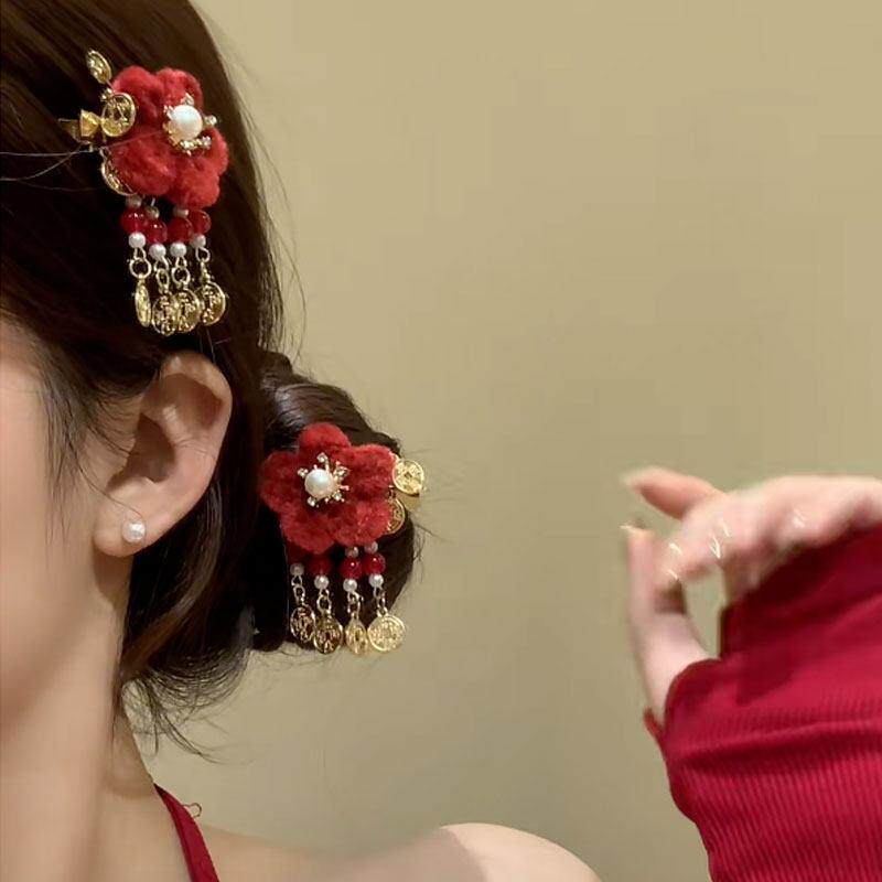 📚 红色毛绒花朵新年发夹铜钱流苏发卡边夹新品洋气显白发饰过年配饰