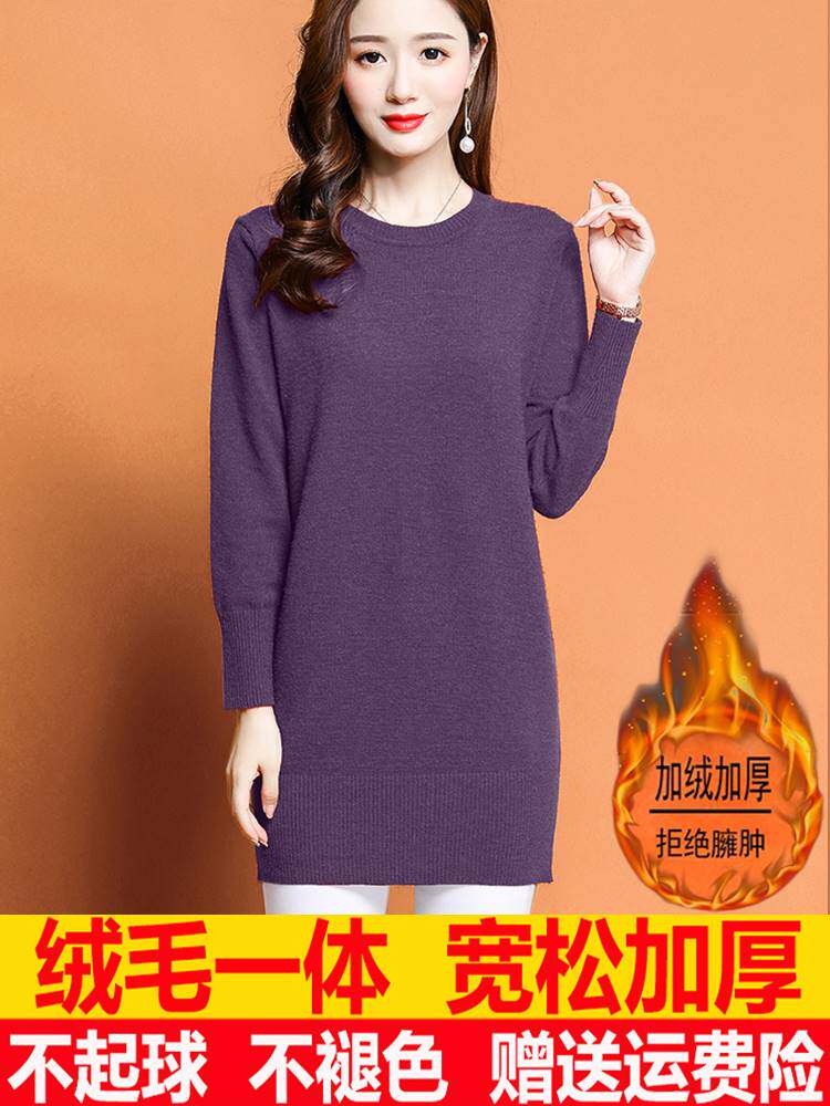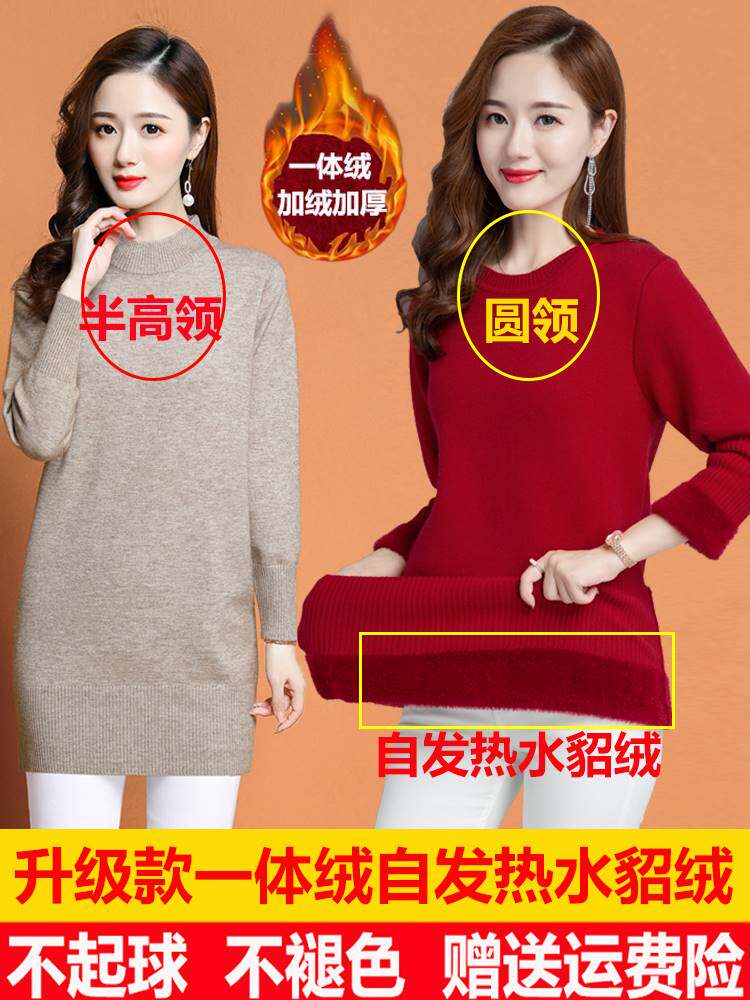 📚 一体绒毛衣女秋冬外穿中长款加绒加厚宽松内搭低领针织打底羊毛衫