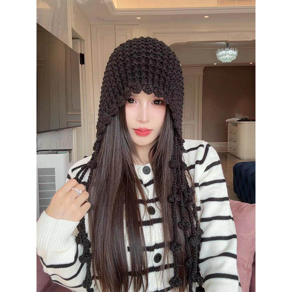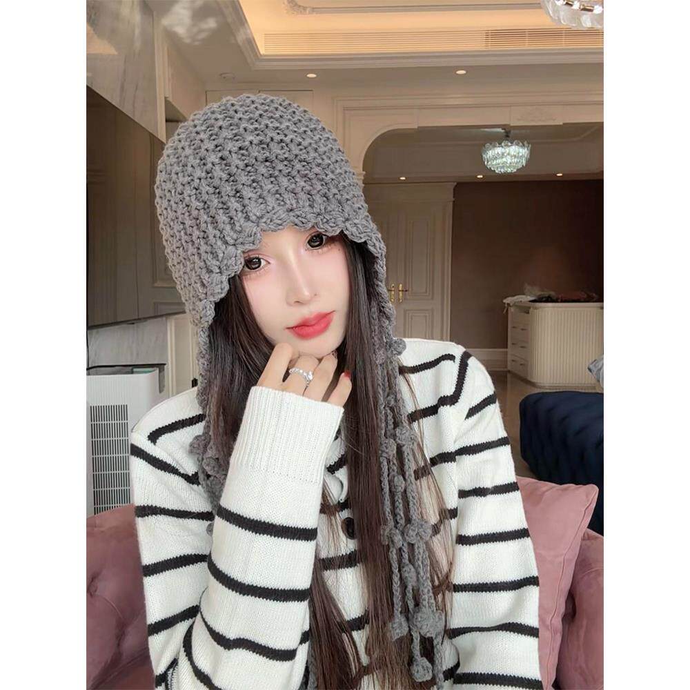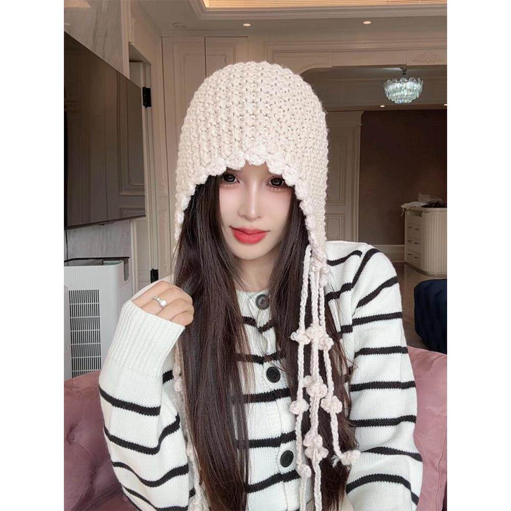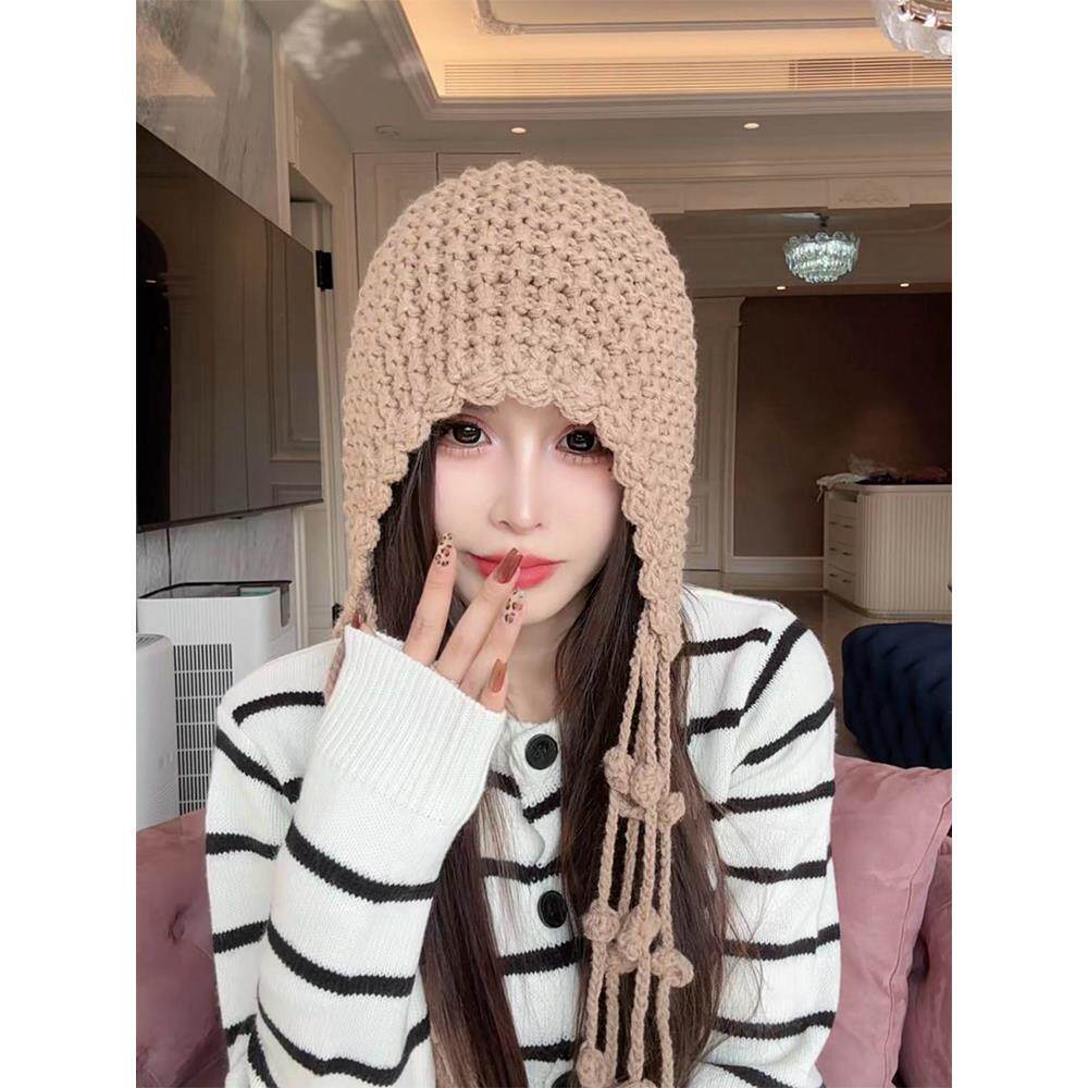 📚 川西旅游红色镂空针织包头帽女秋季显脸小流苏毛线帽手工编织帽子