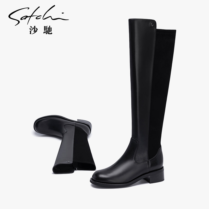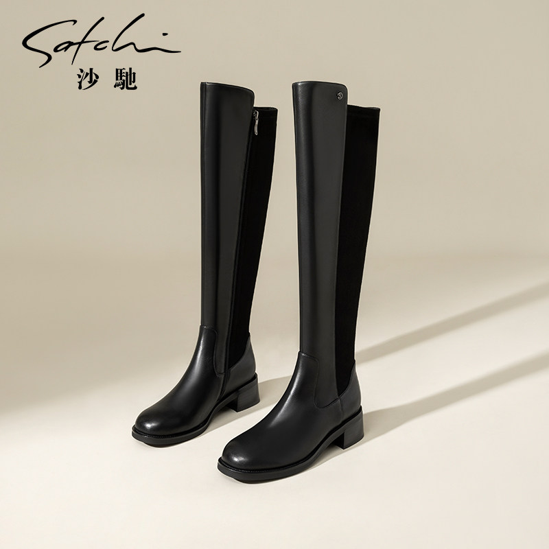 📚 沙驰女鞋时尚拼接弹力骑士靴2025年冬季新款粗跟瘦瘦靴过膝长筒靴