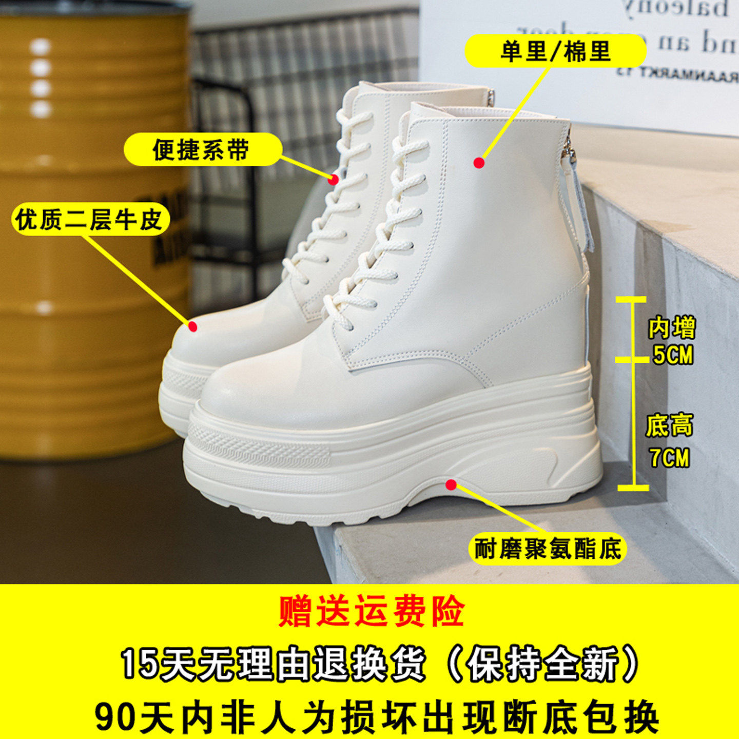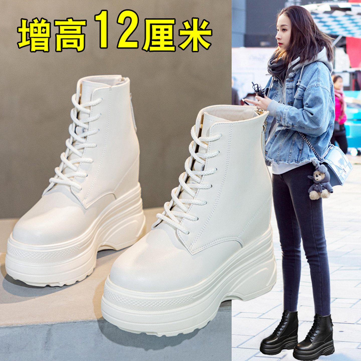📚 超火短靴内增高12厘米cm小个子女靴秋冬加绒保暖真皮厚底马丁靴子