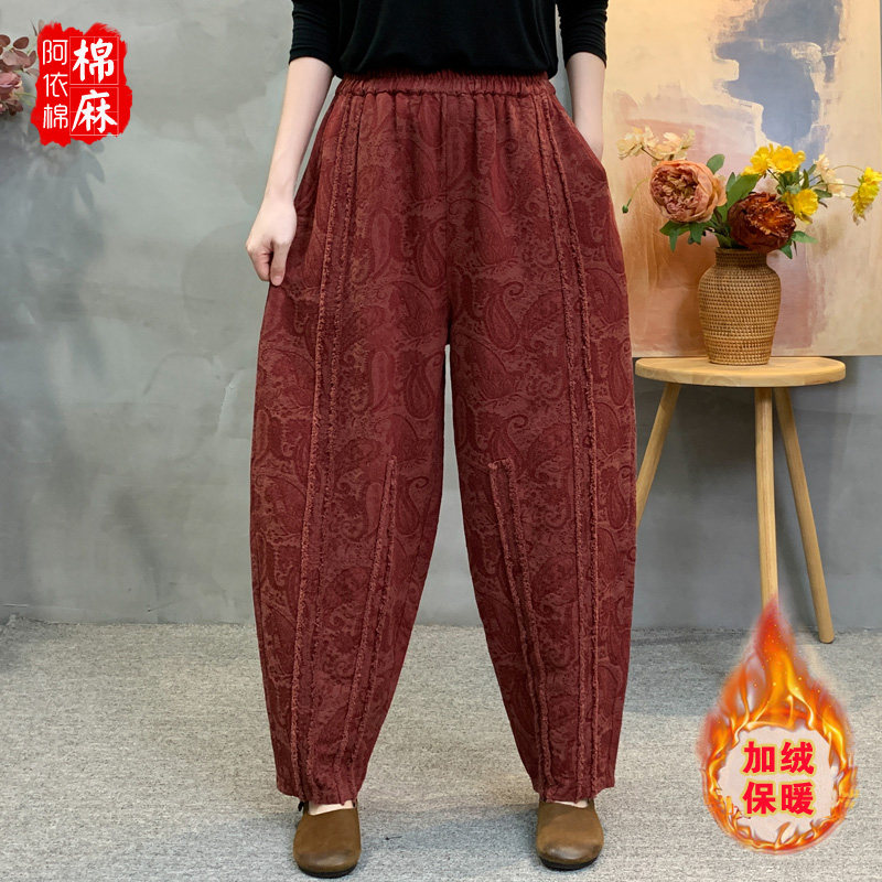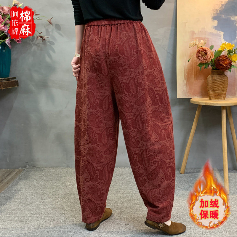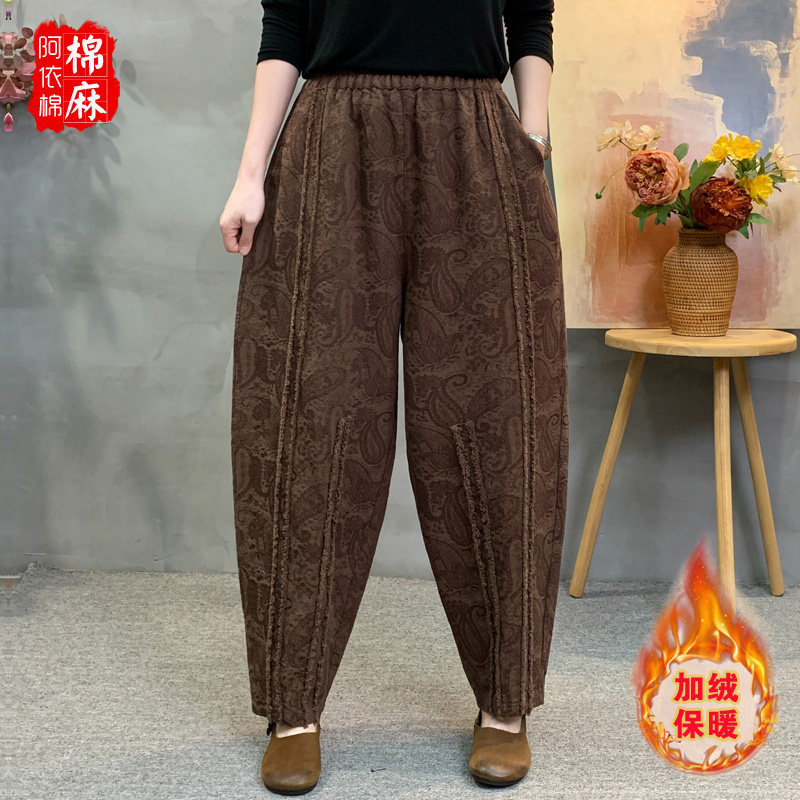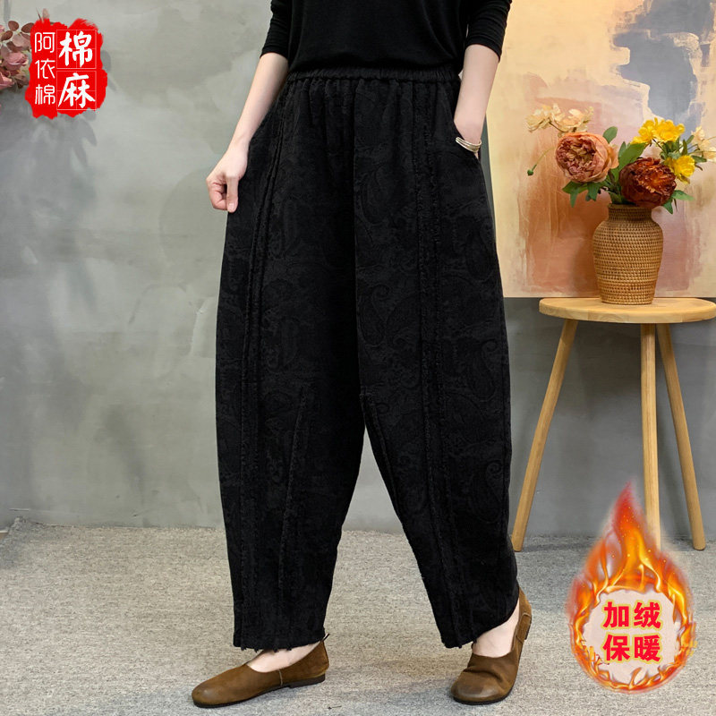 📚 秋冬新款棉麻提花加绒哈伦裤女宽松百搭洋气加厚保暖妈妈装长裤女