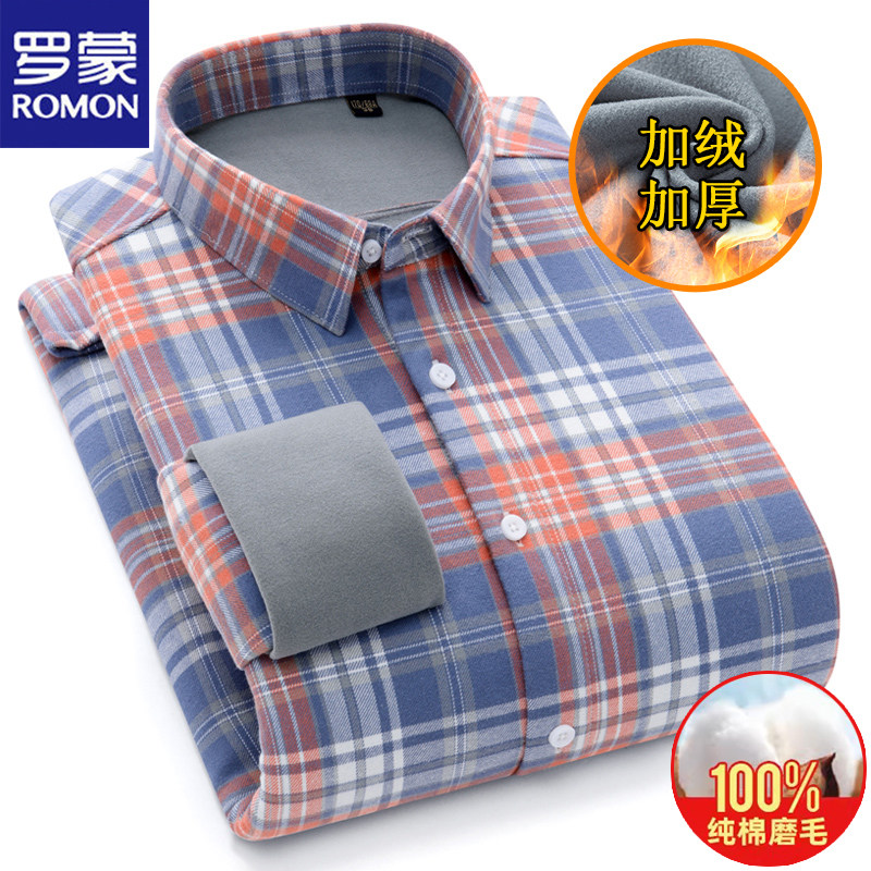 📚 100%纯棉罗蒙长袖衬衫男士格子春秋季全棉磨毛衬衣爸爸装口袋上衣