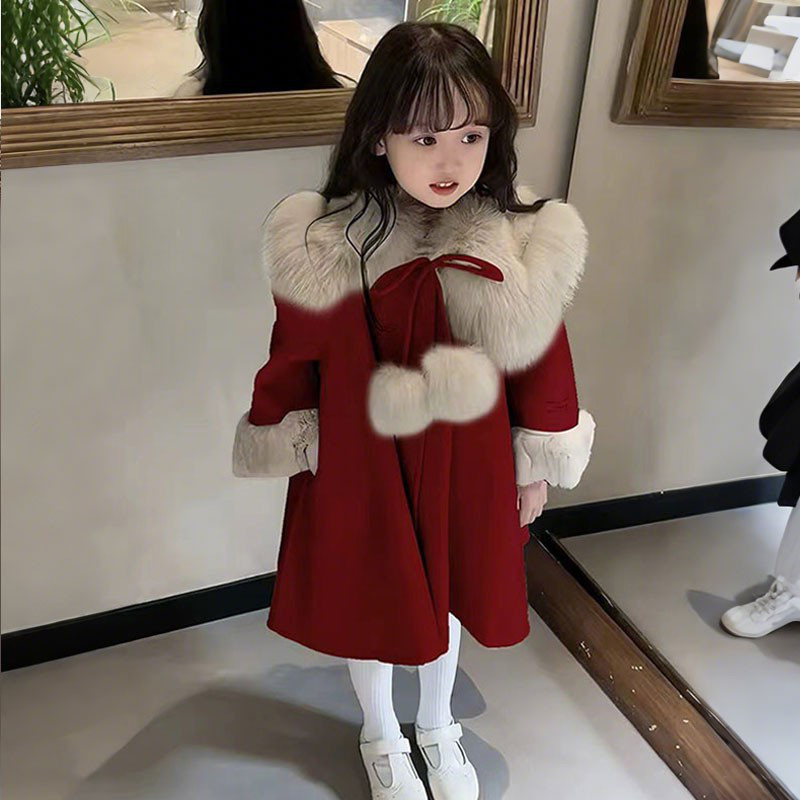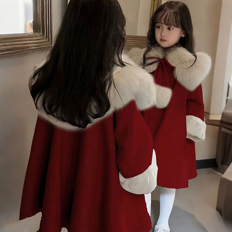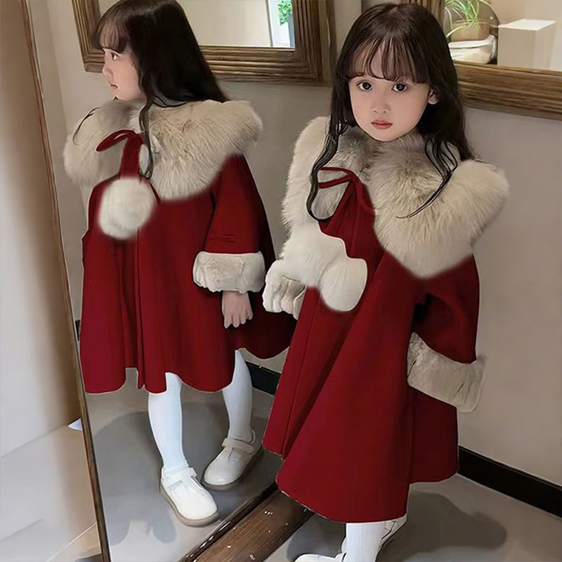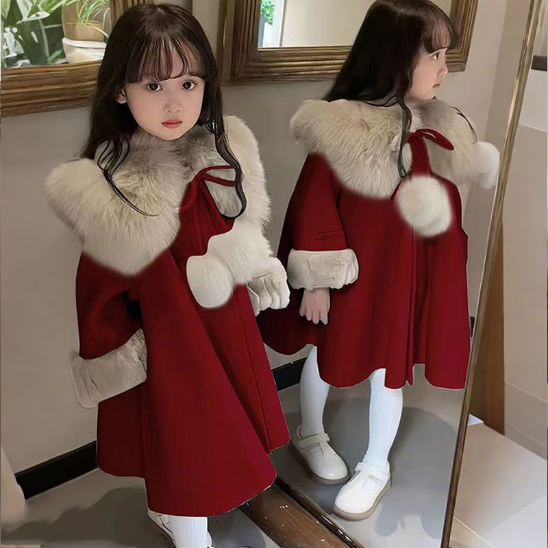 📚 女童呢子大衣秋冬装2025新款韩版中长款红色加绒斗篷加厚拜年服