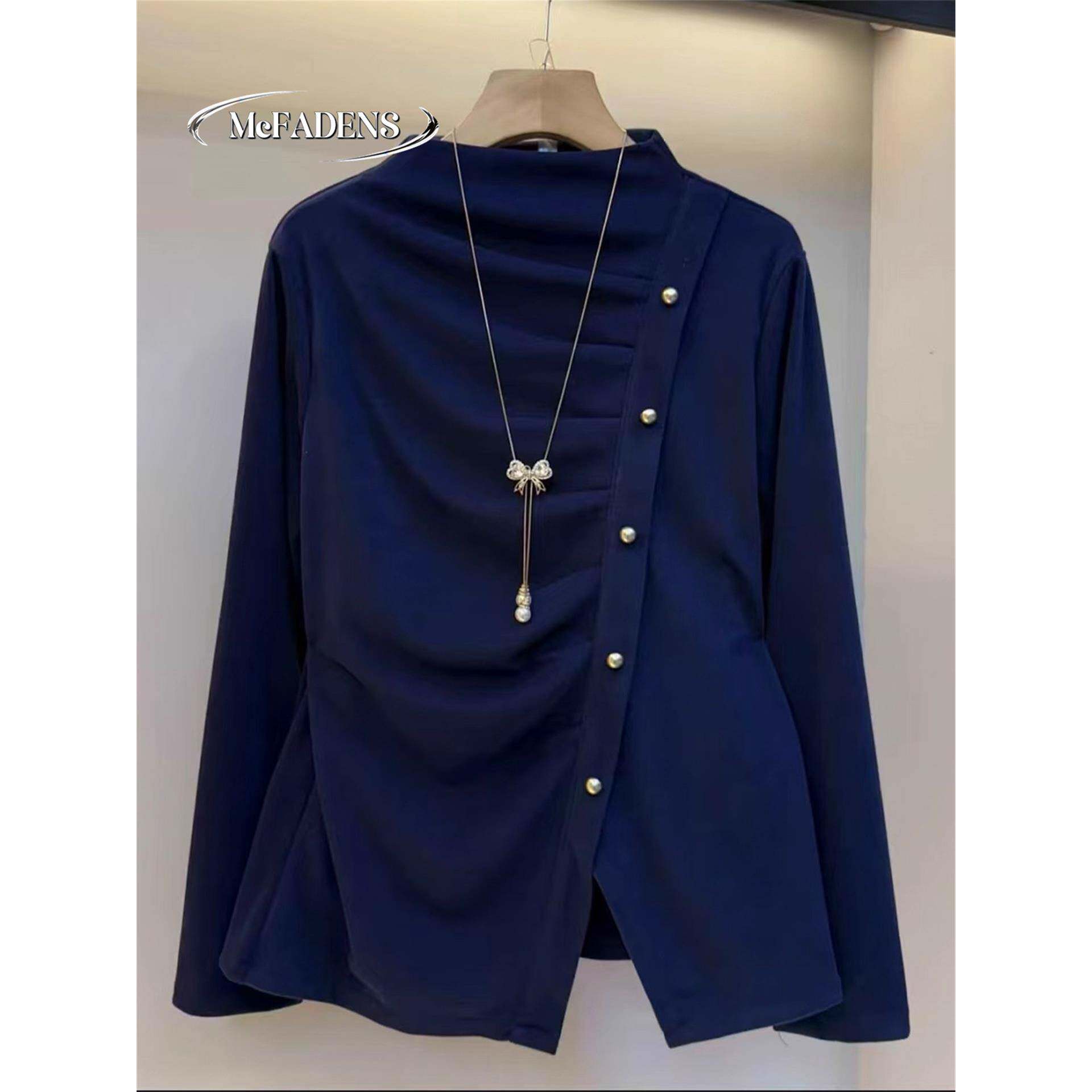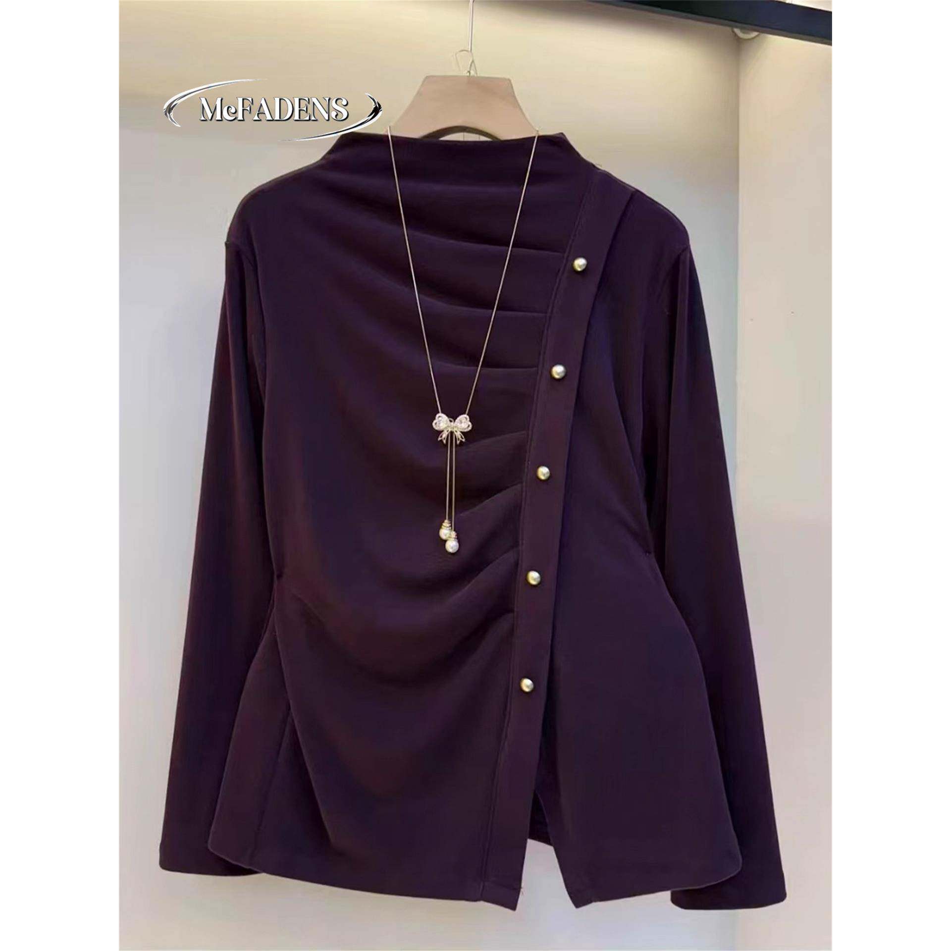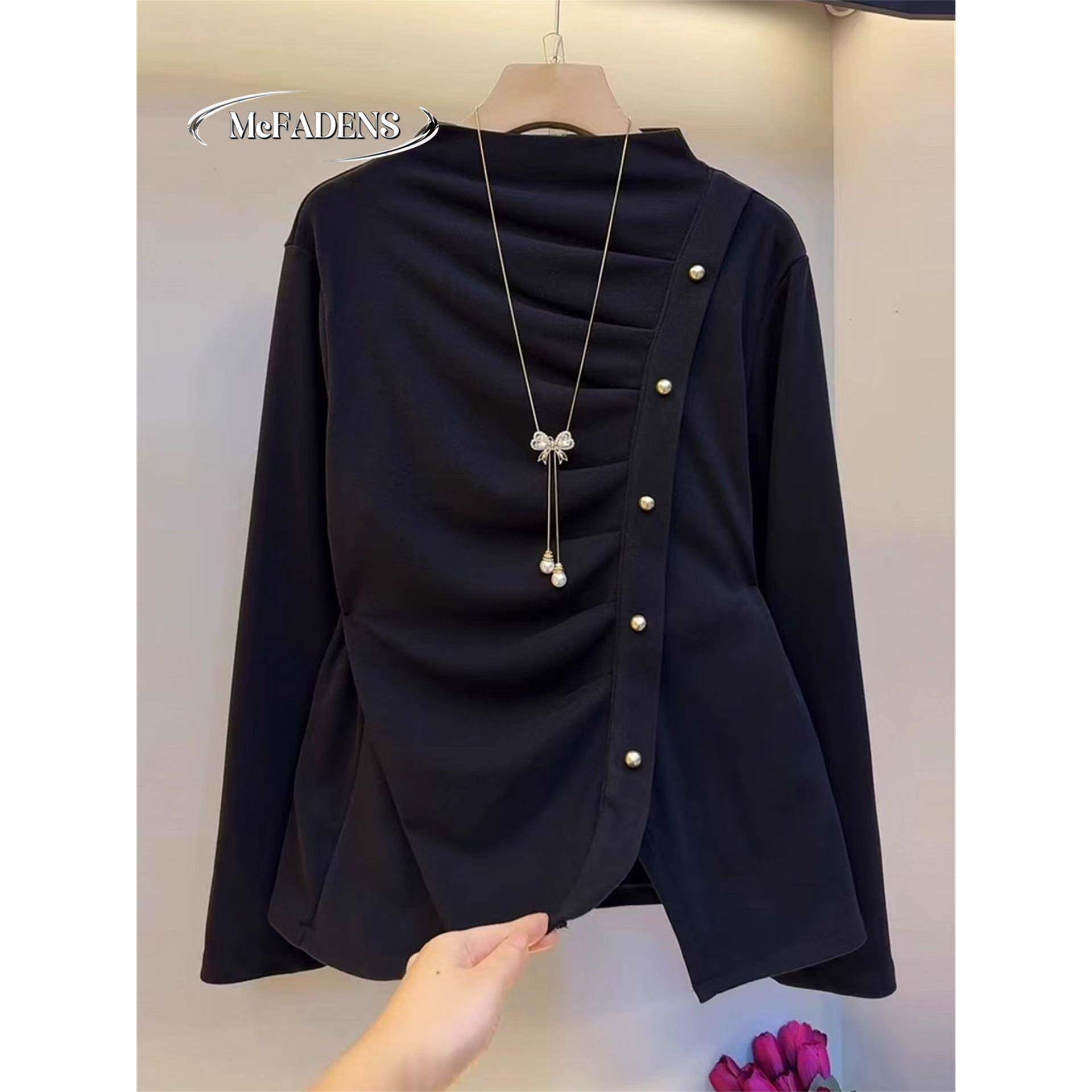📚 香港时尚不规则褶皱打底衫港风胖妹妹大码冬季新款显瘦长袖T恤衫
