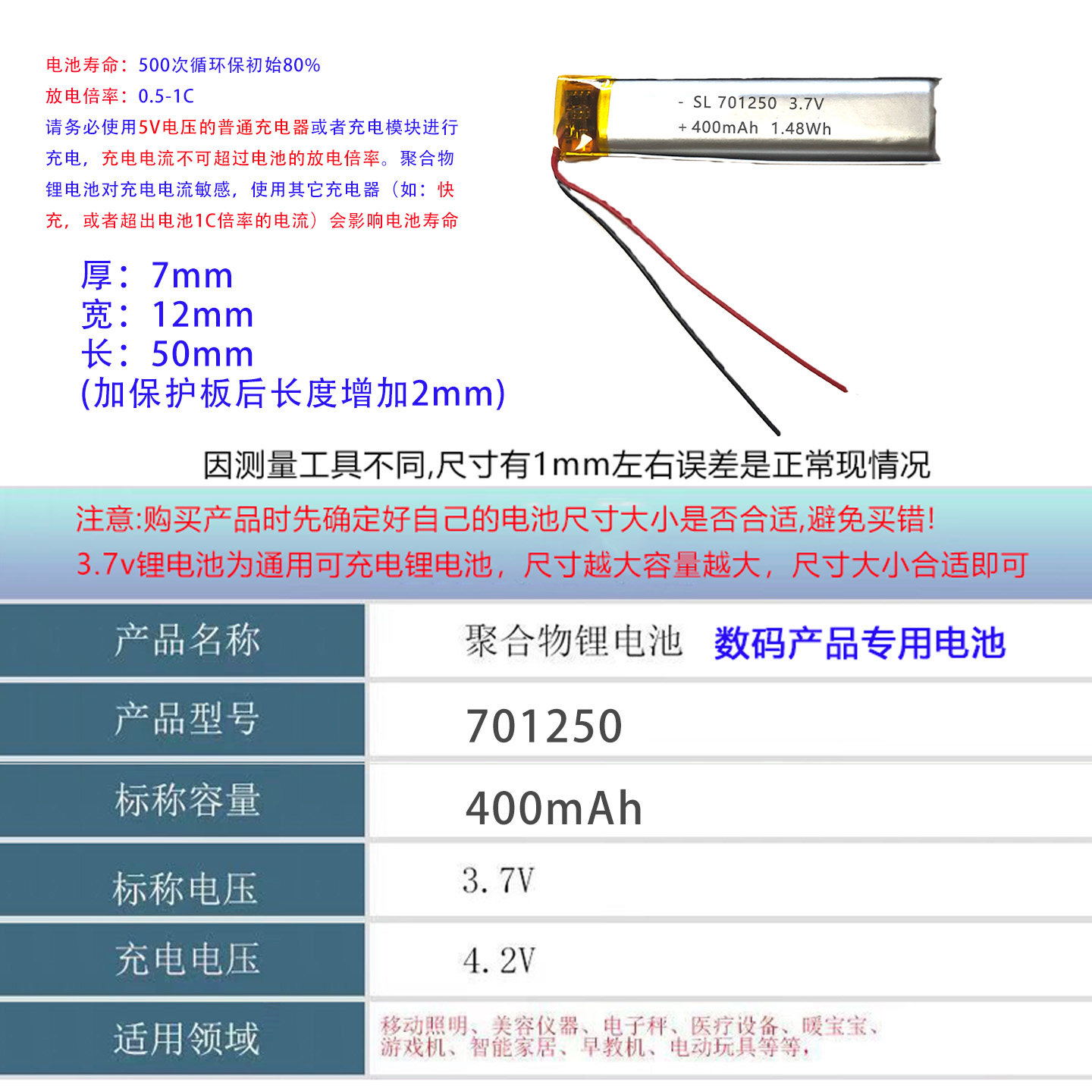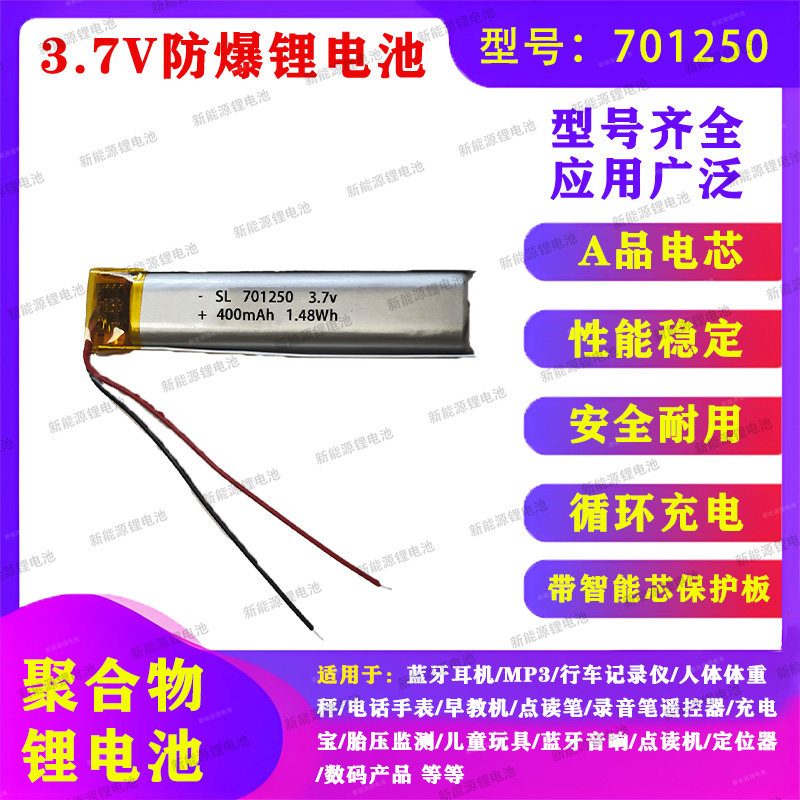 📚 701250智能穿戴微型MP4 3.7V聚合物电池软包锂电池通用型充电电池
