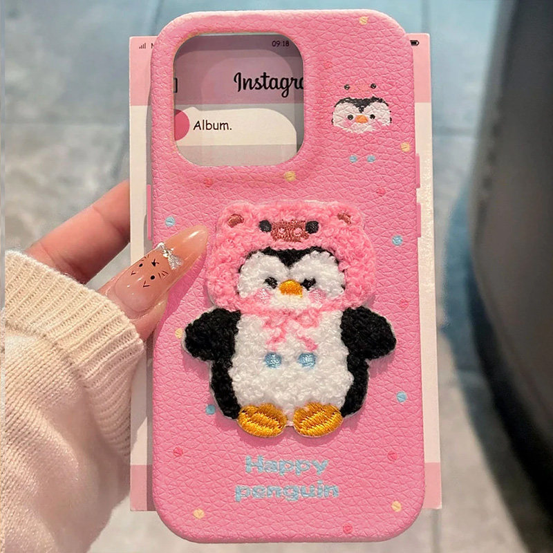 📚 可爱卡通刺绣毛绒企鹅适用苹果16Promax手机壳iPhone13新款15高级感14保护套16防摔15Pro硅胶全包情侣女款软p