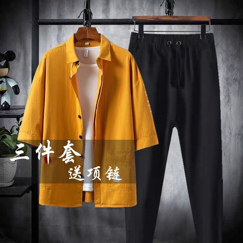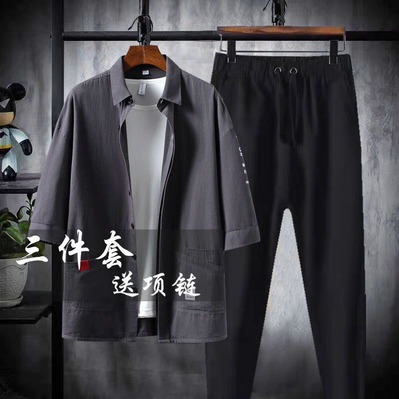 📚 三件套】春夏季港风潮男套装一套薄款帅气潮流搭配七分袖衬衫