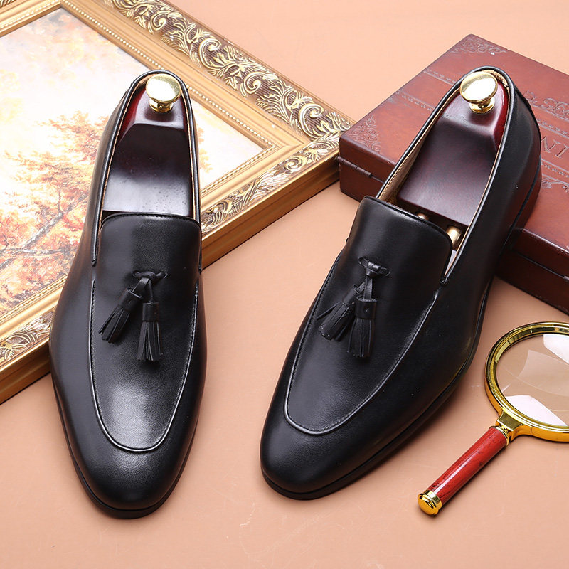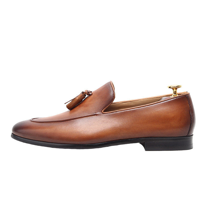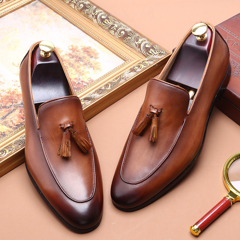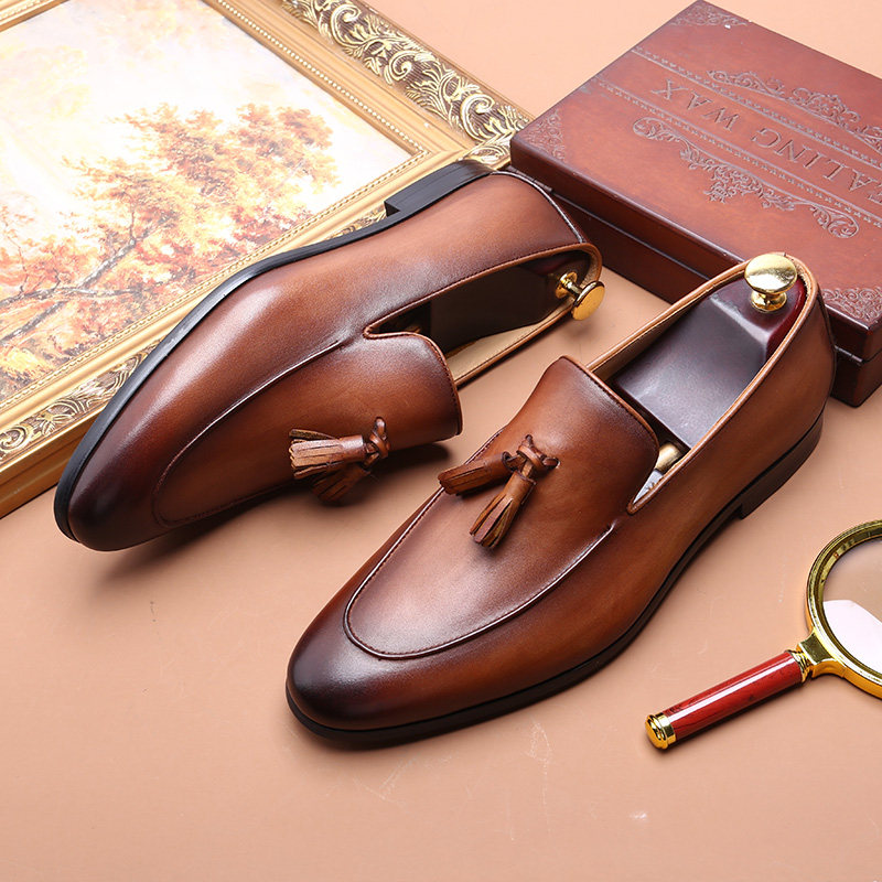 📚 英伦套脚乐福复古流苏鞋男士真皮手工鞋尖头一脚蹬商务休闲皮鞋