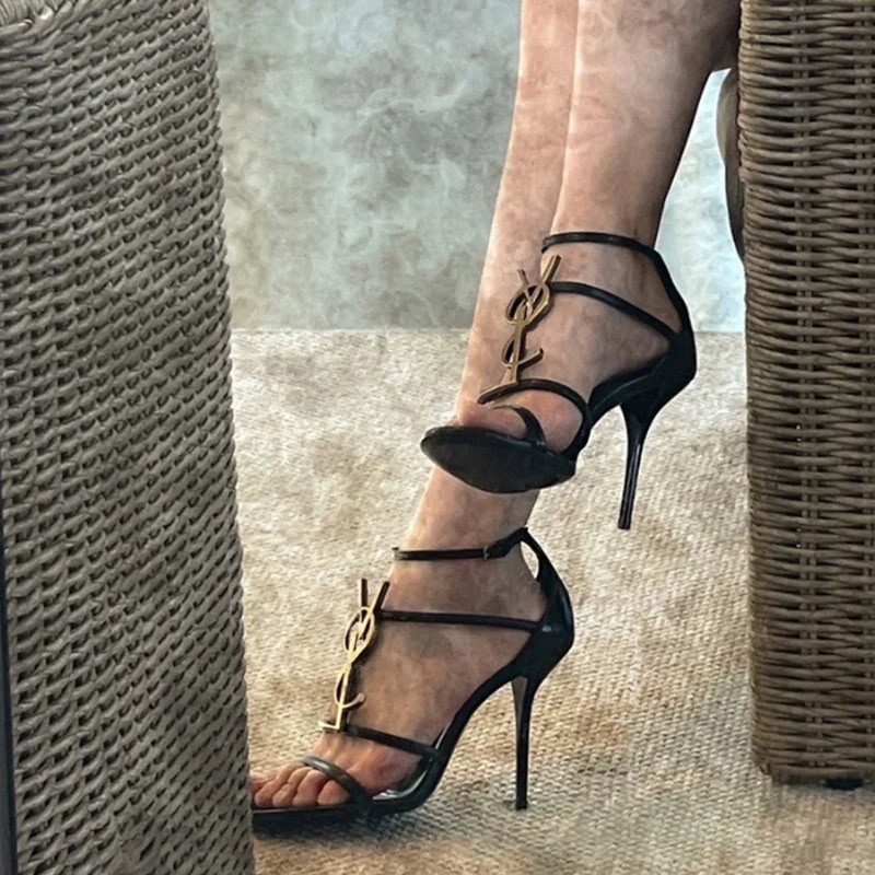 📚 黑色一字带高跟鞋女御姐风2026新款漆皮性感露趾字母徽标细跟凉鞋