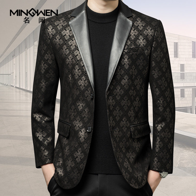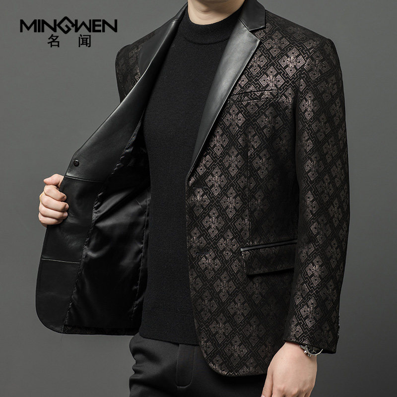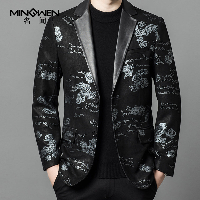 📚 真皮皮衣西装男秋冬薄款韩版修身潮流痞帅印花绵羊皮休闲西服外套