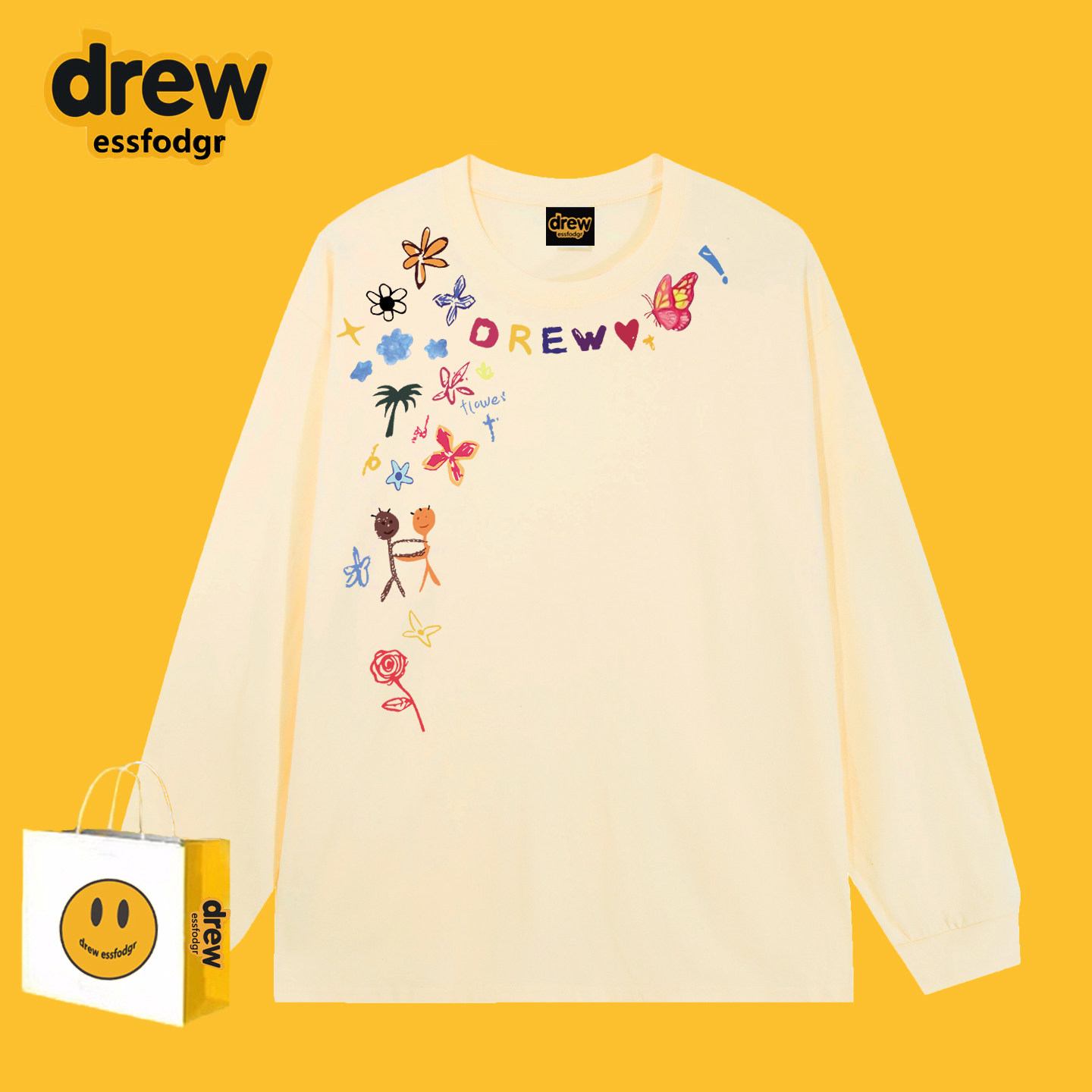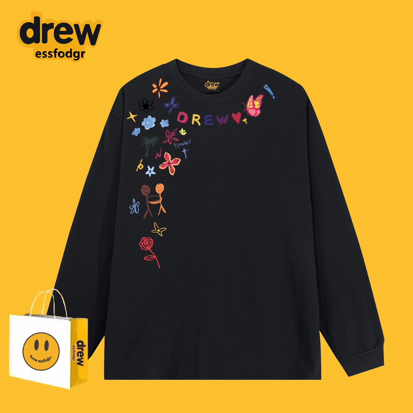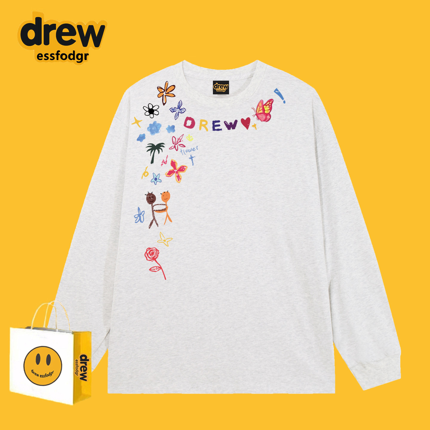 📚 Drew美式潮牌涂鸦小花字母印花长袖T恤男女春秋百搭宽松打底上衣