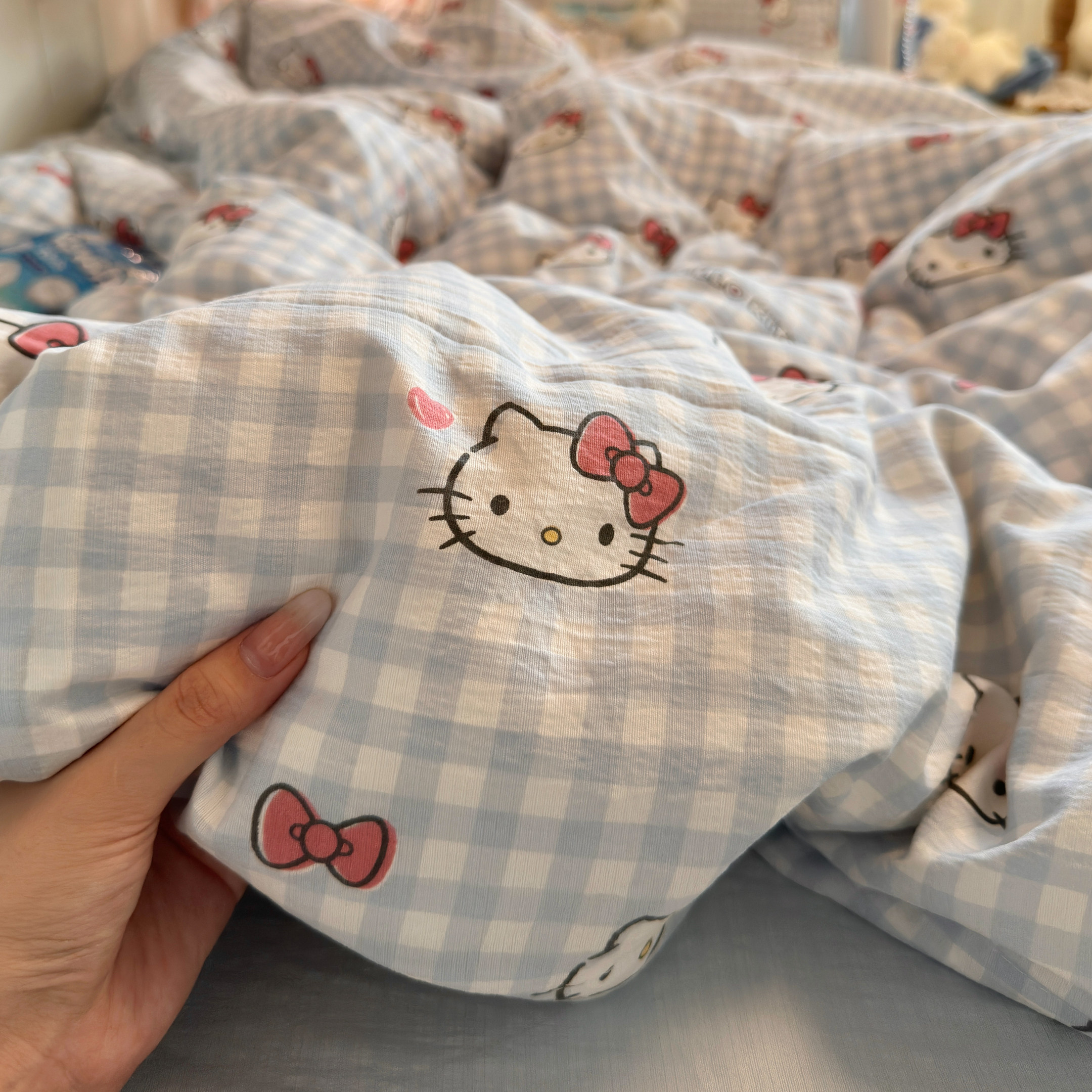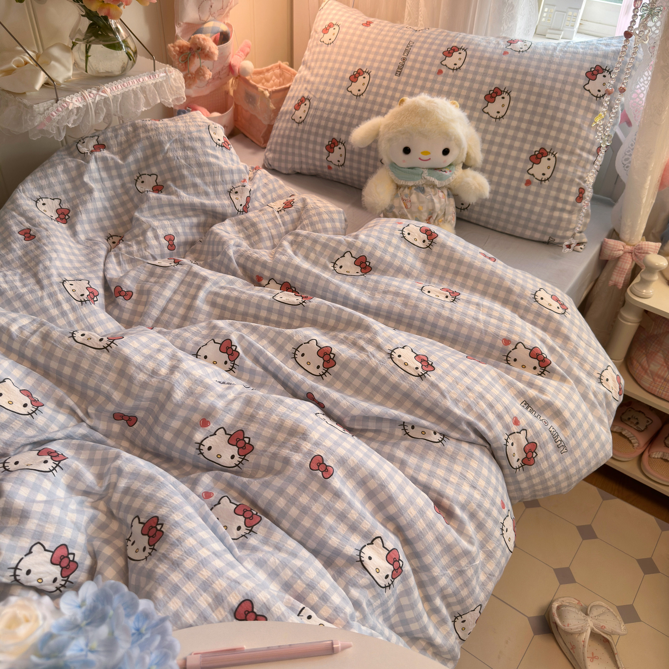 📚 小清新ins简约蓝格kt猫水洗棉四件套全棉被套学生宿舍床单三件套