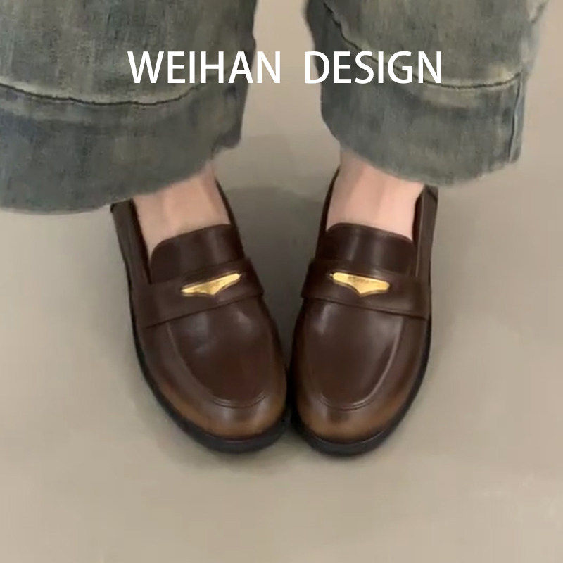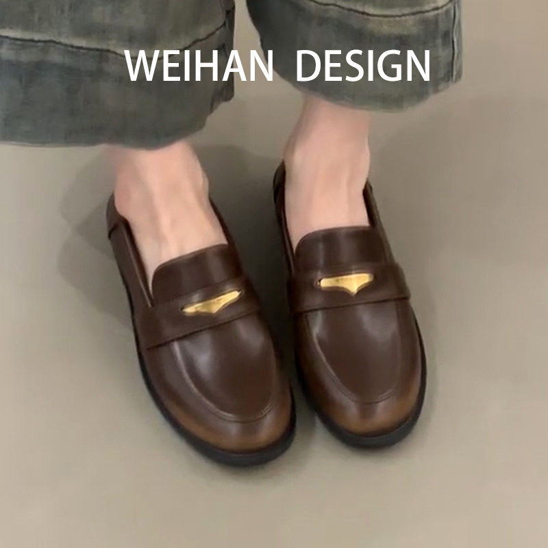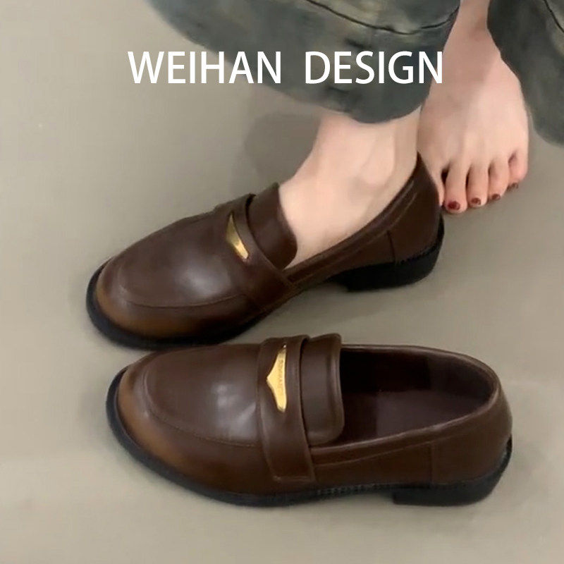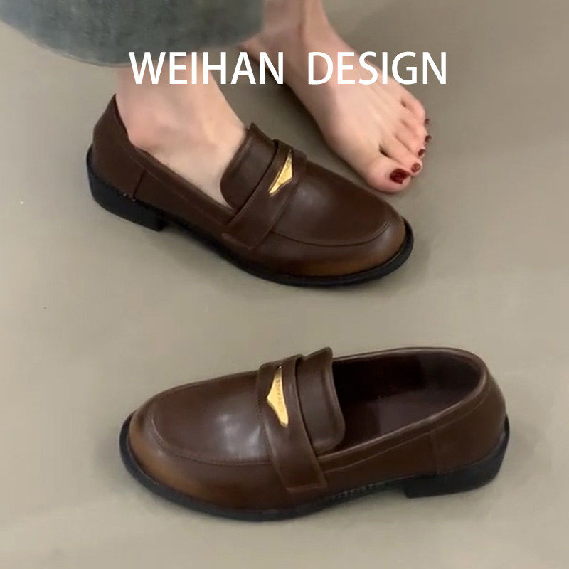 📚 羊皮版~英伦复古圆头一脚蹬乐福鞋简约厚底棕色百搭小皮鞋女单鞋