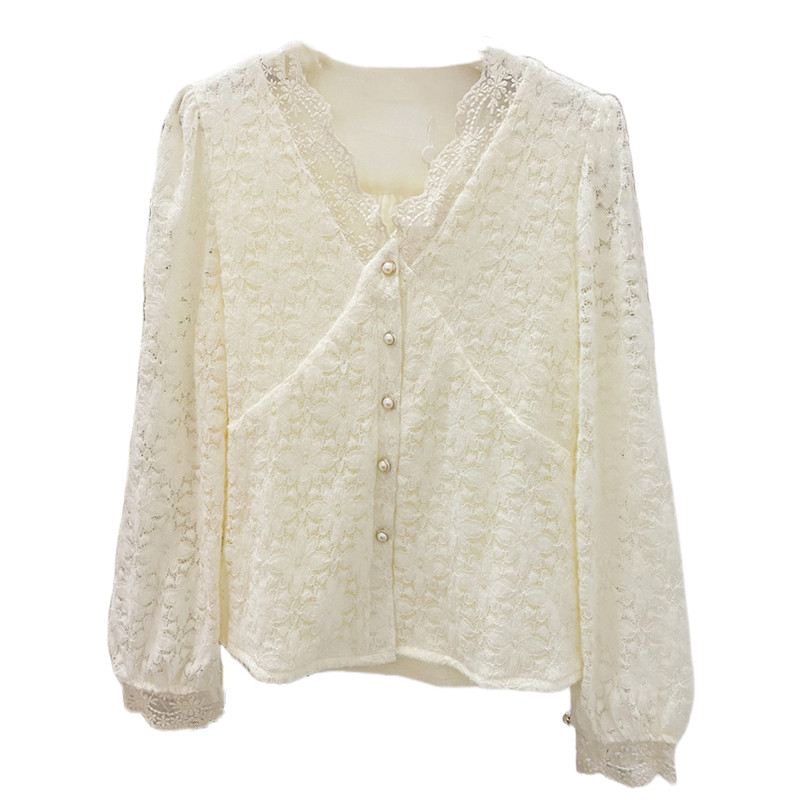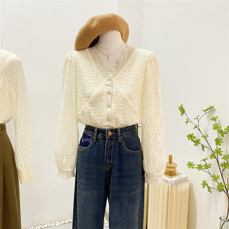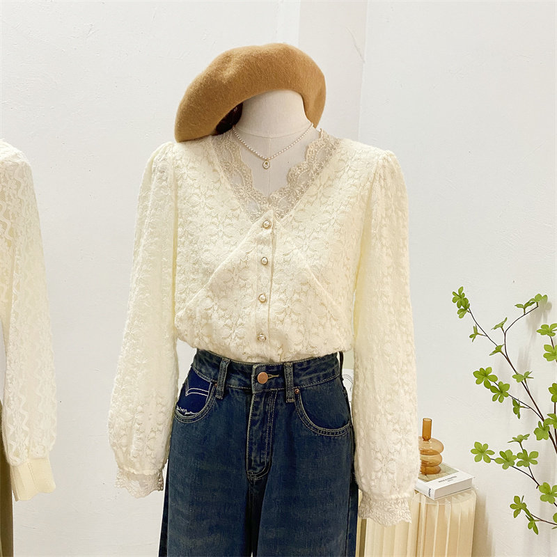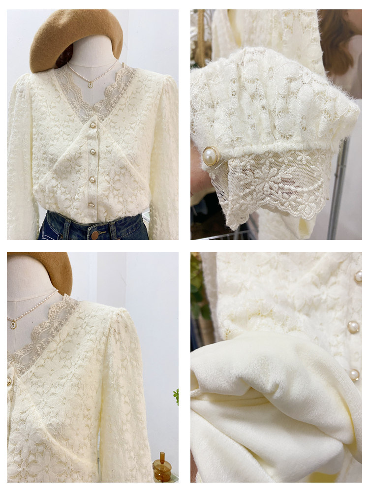 📚 法式V领蕾丝衫加绒加厚灯笼袖衬衫女秋冬气质内搭打底衫洋气小衫