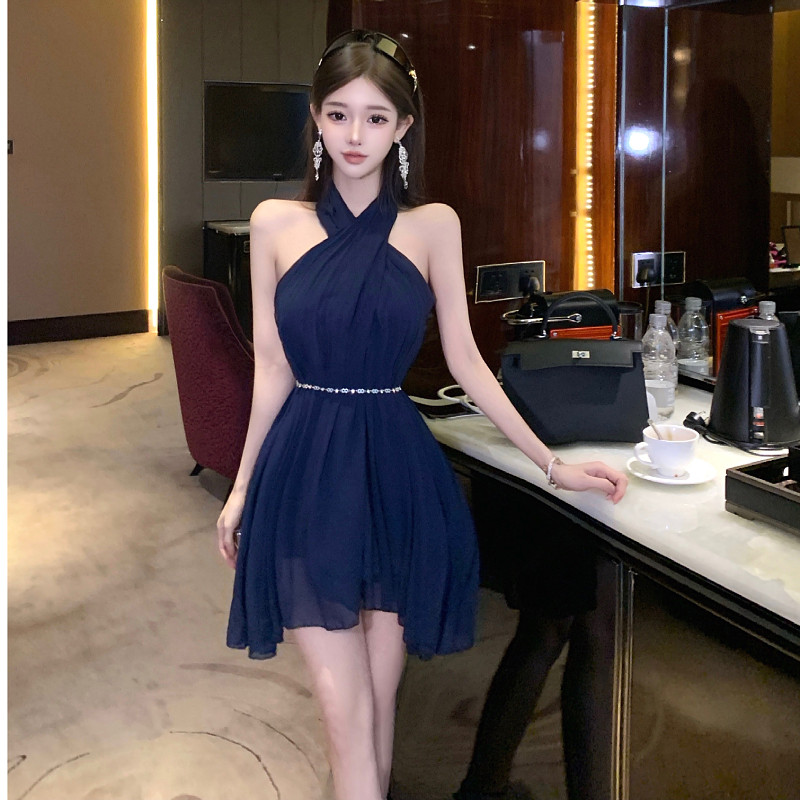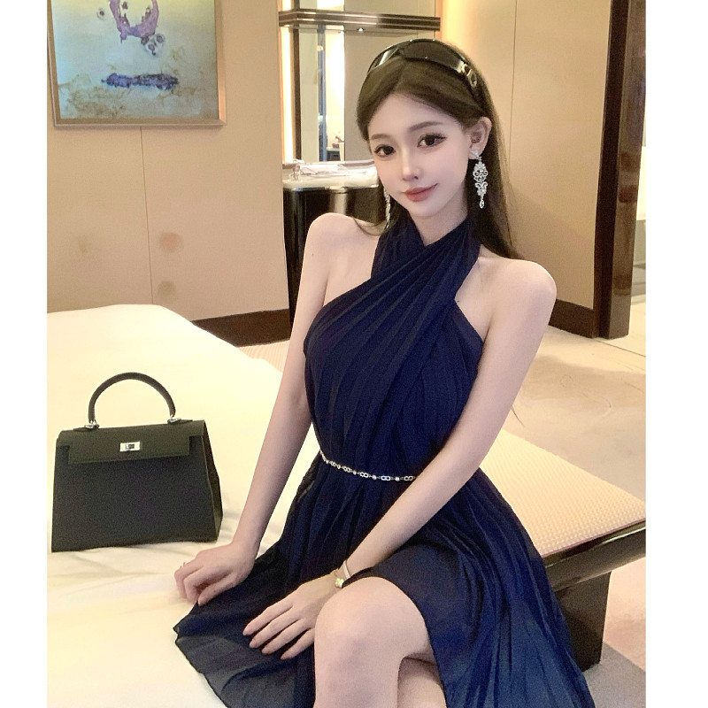 📚 古早韩味挂脖连衣裙女装蓝色裙礼服褶皱连身裙纯欲风性感收腰裙子