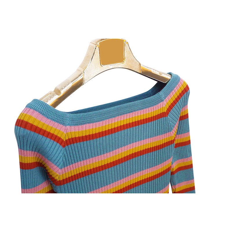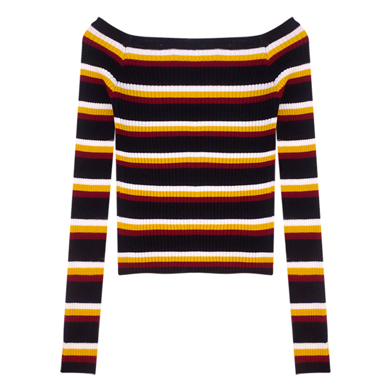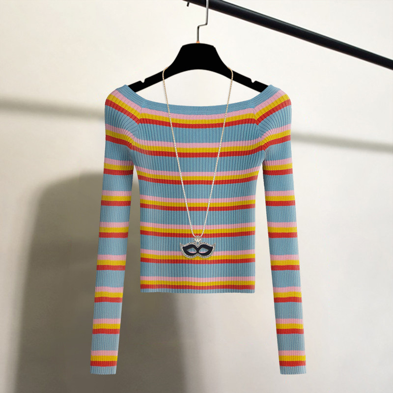 📚 高腰一字漏肩条纹针织衫漂亮显白紧身内搭打底衫上衣毛衣女秋冬新