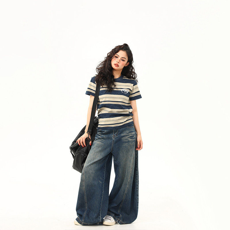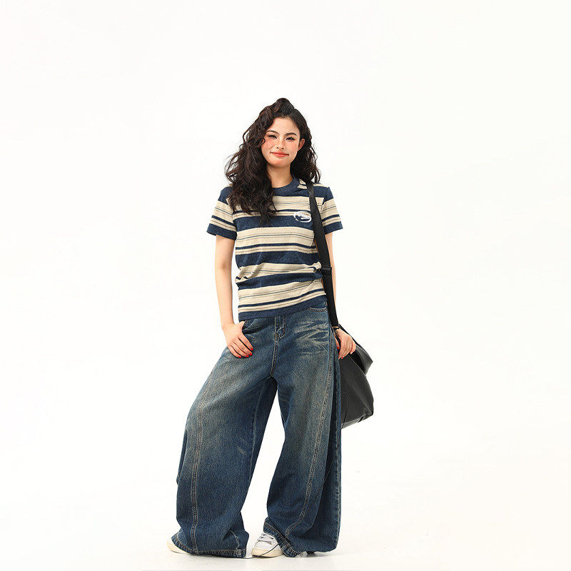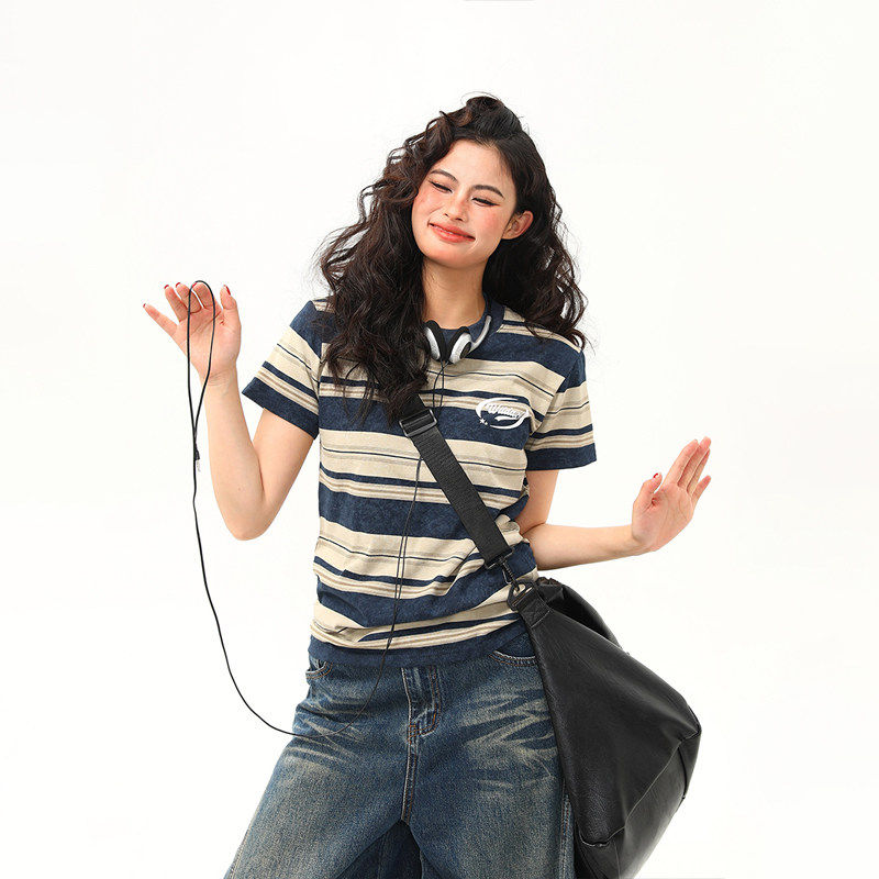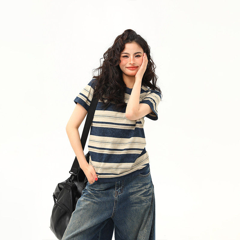 📚 野生阿子原创美式覆古微宽松条纹正肩短袖T恤女夏季百搭短款上衣
