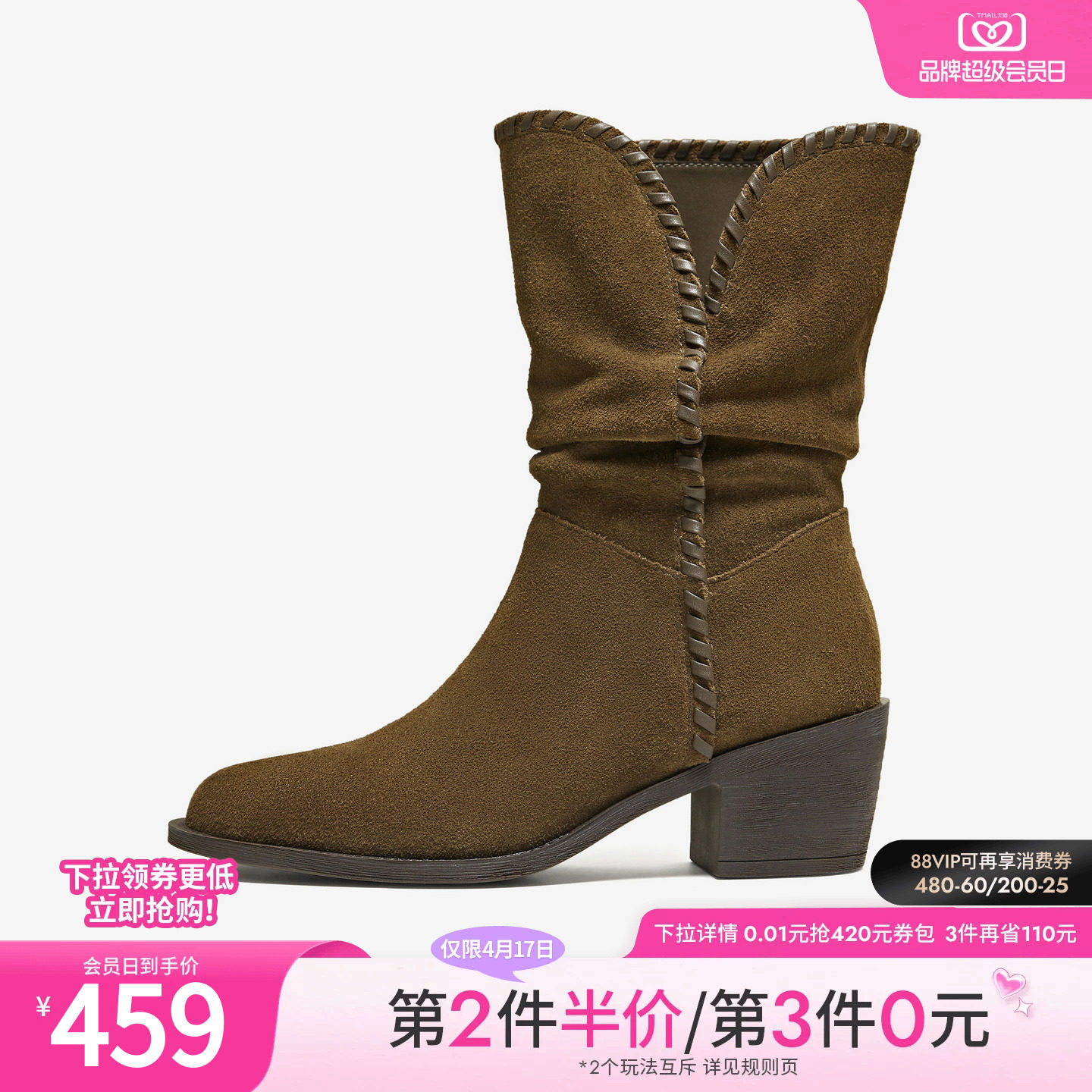 📚 TATA他她西部靴2025冬粗跟中筒靴尖头堆堆靴骑士靴短靴NWU01DS5