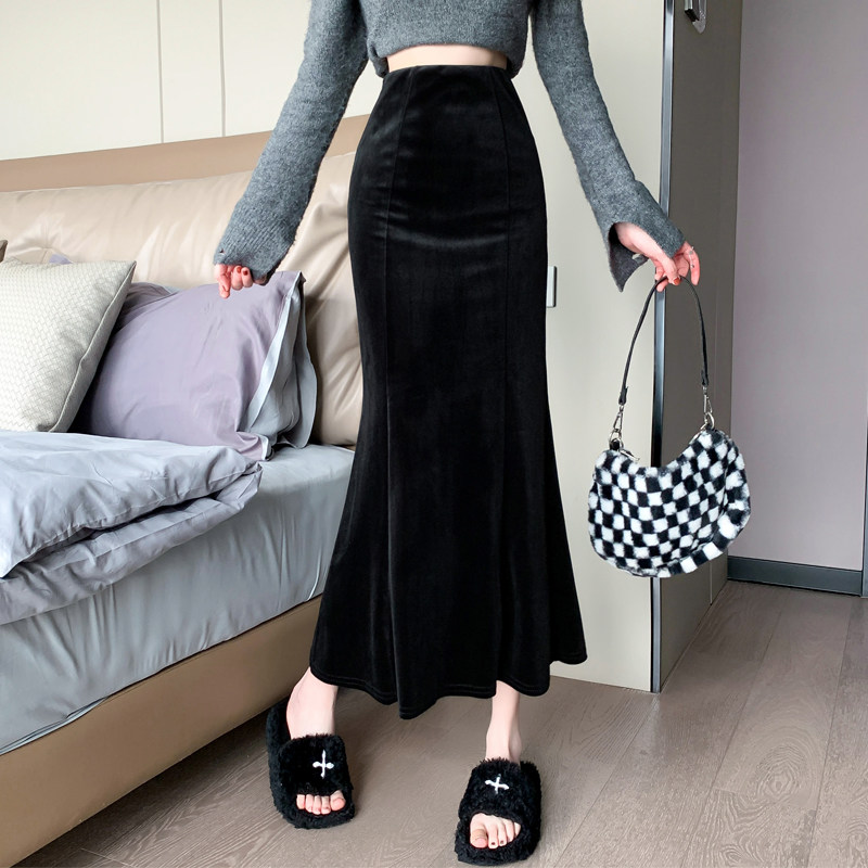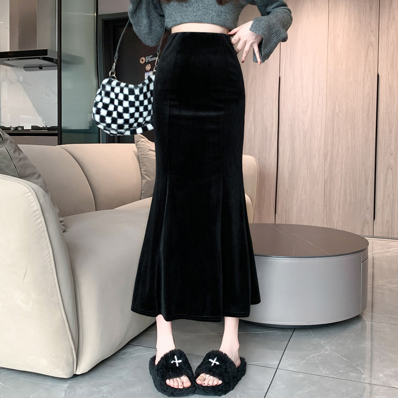 📚 黑色金丝绒半身裙女秋冬天加绒加厚高腰显瘦中长款a字包臀鱼尾裙