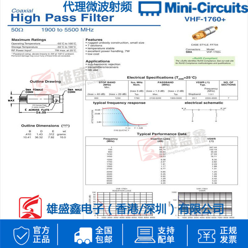 📚 Mini-Circuits VHF-1760+ 1900-5500MHZ 50Ω 射频高通滤波器 SMA