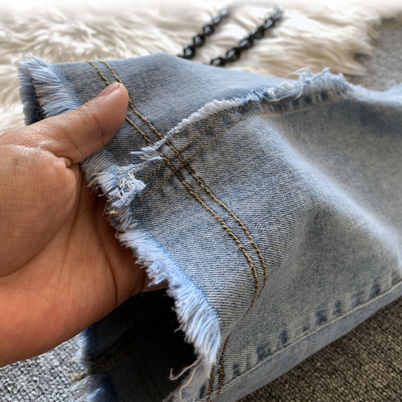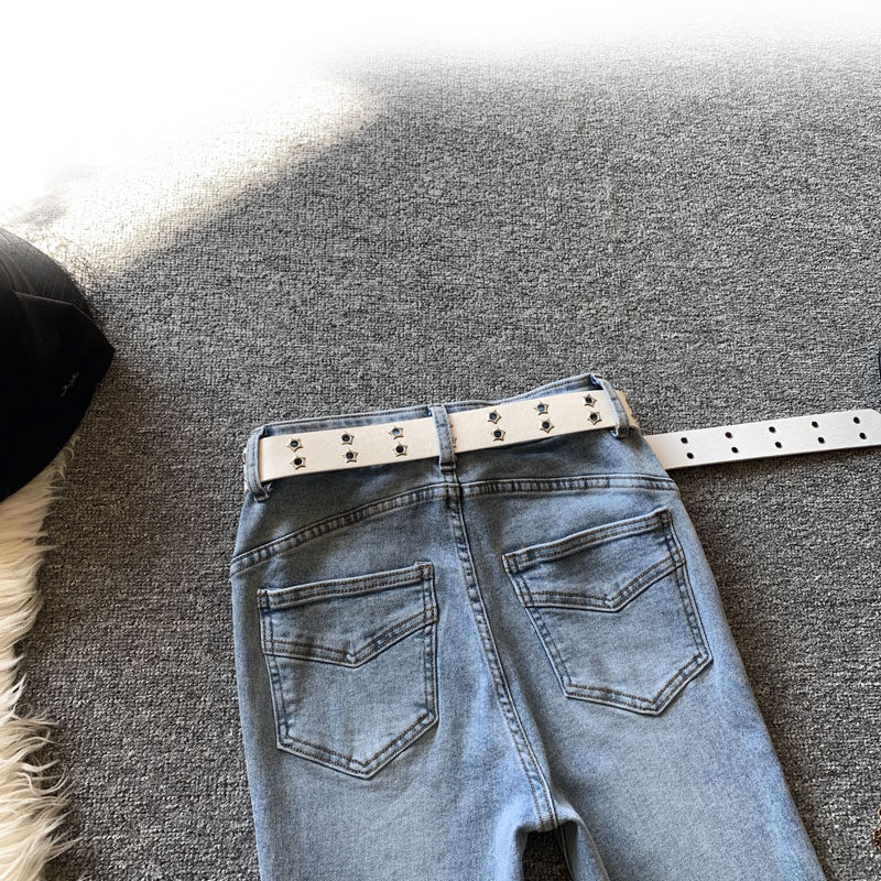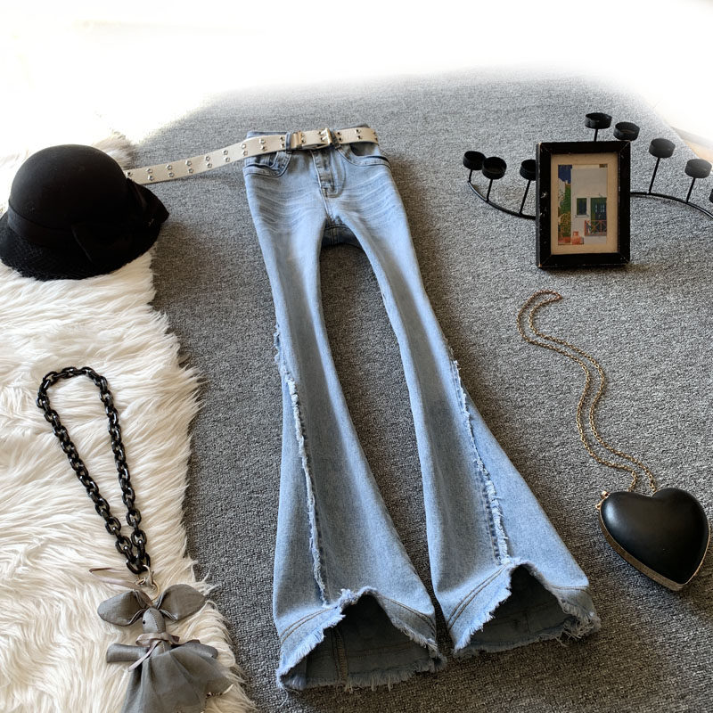 📚 浅蓝色高腰微喇牛仔裤女春季美式辣妹风显瘦修身拼接毛边喇叭长裤