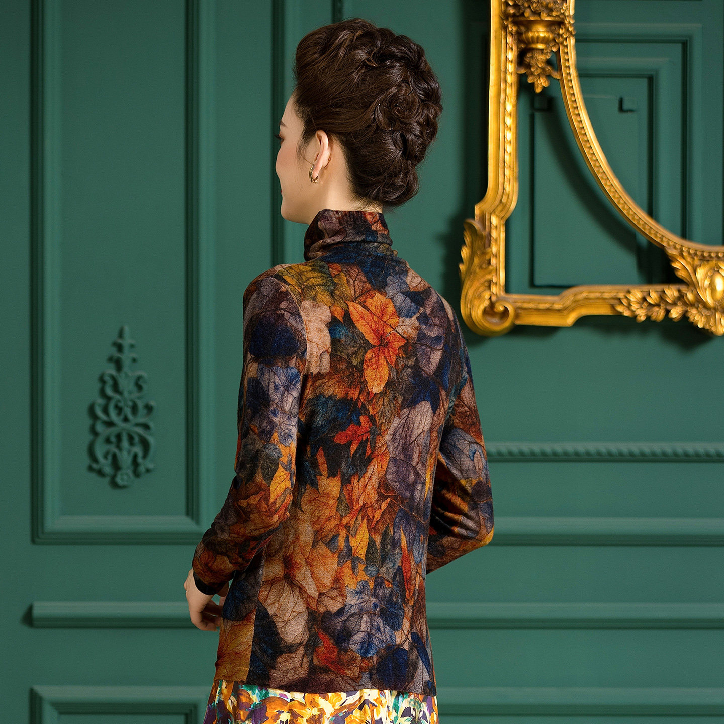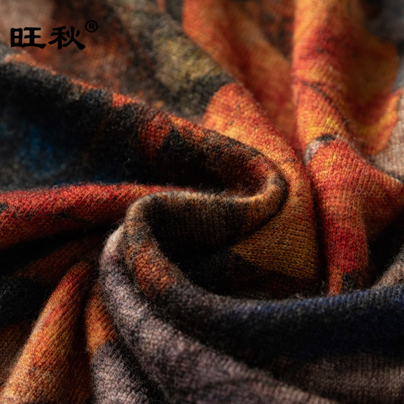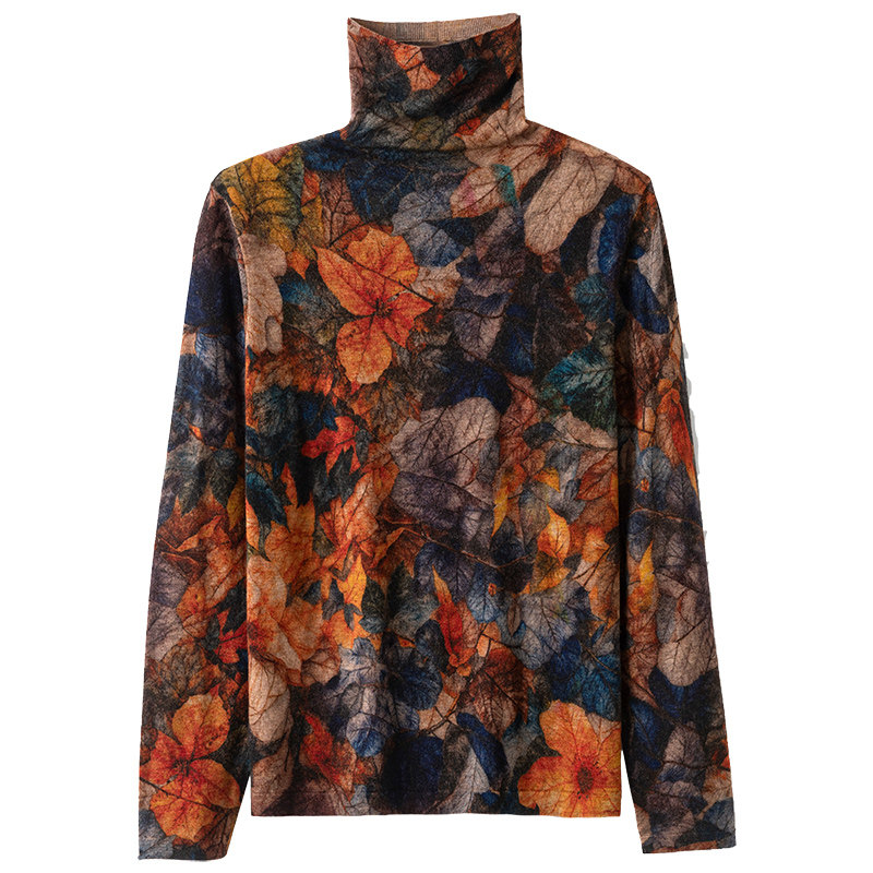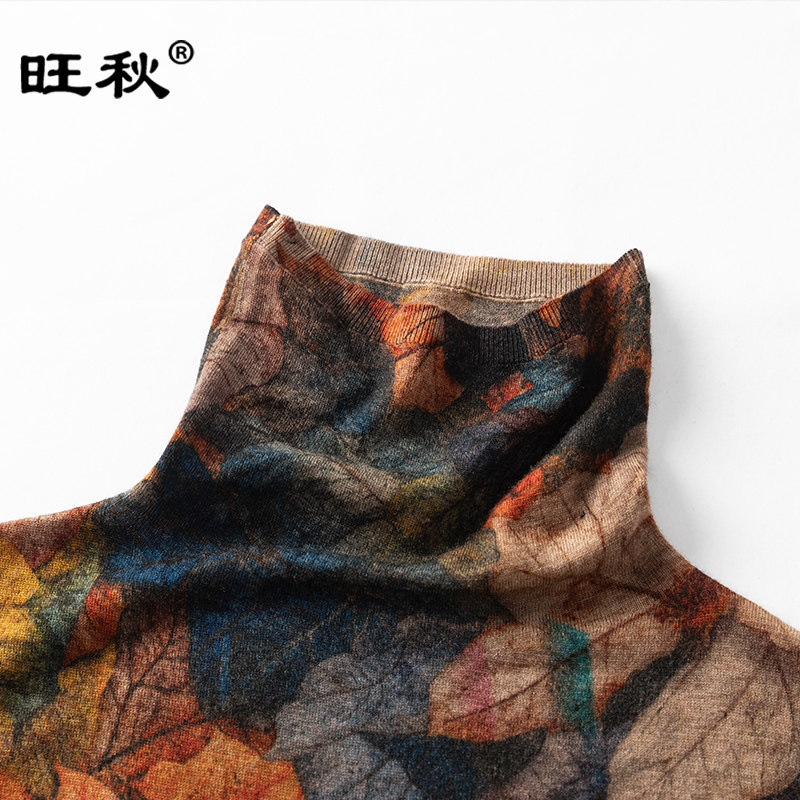 📚 旺秋薄款印花羊毛衫女100%水溶羊毛超细精纺打底衫时尚堆堆领毛衣