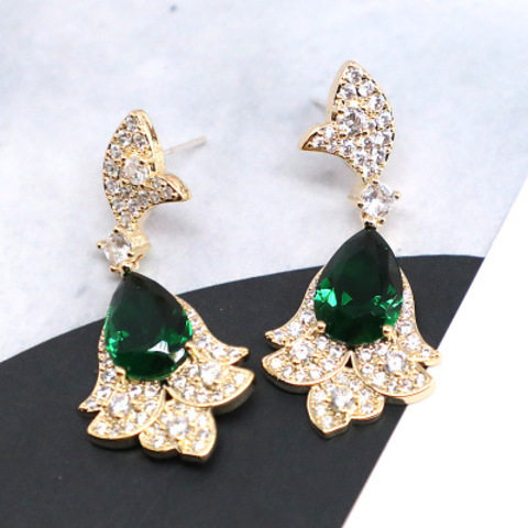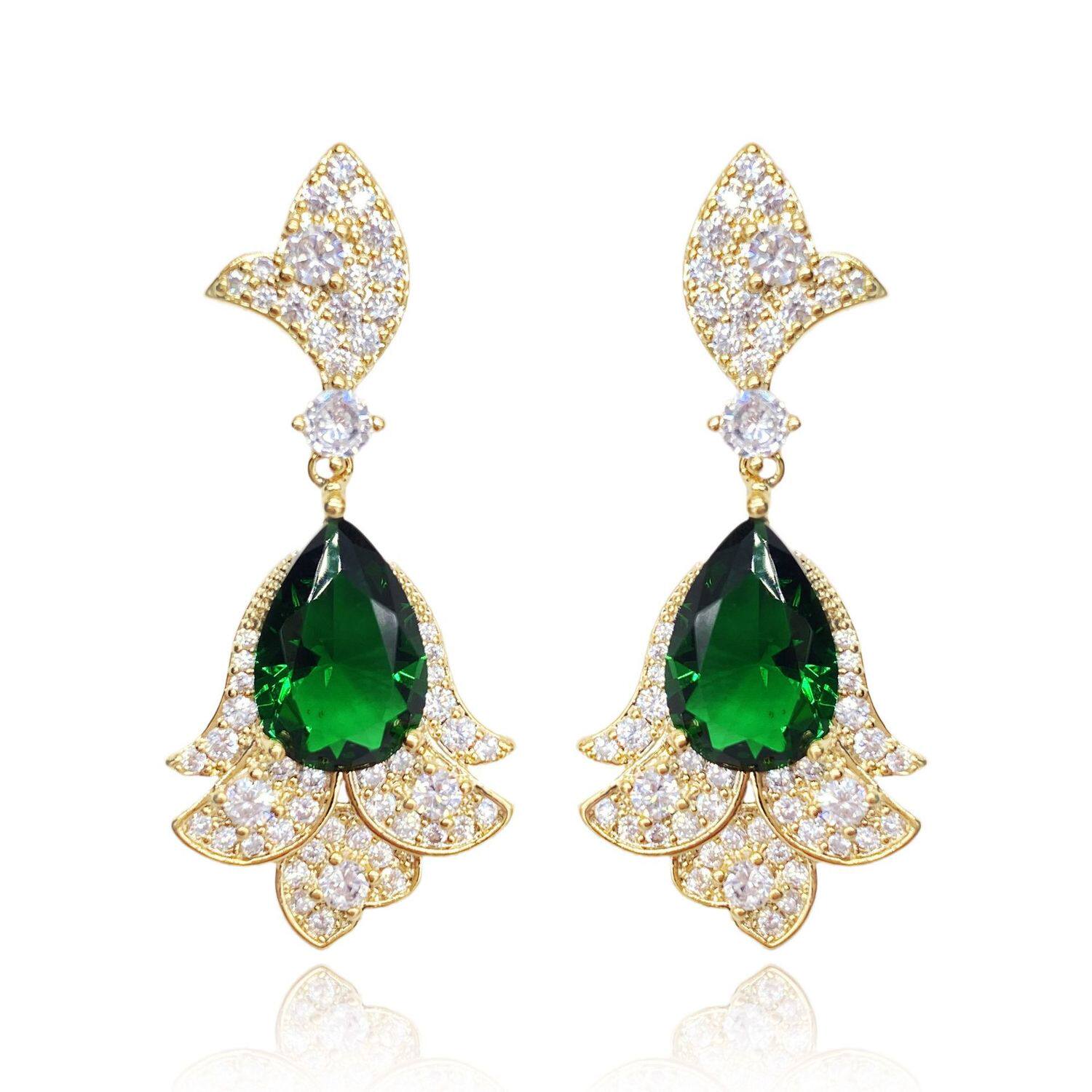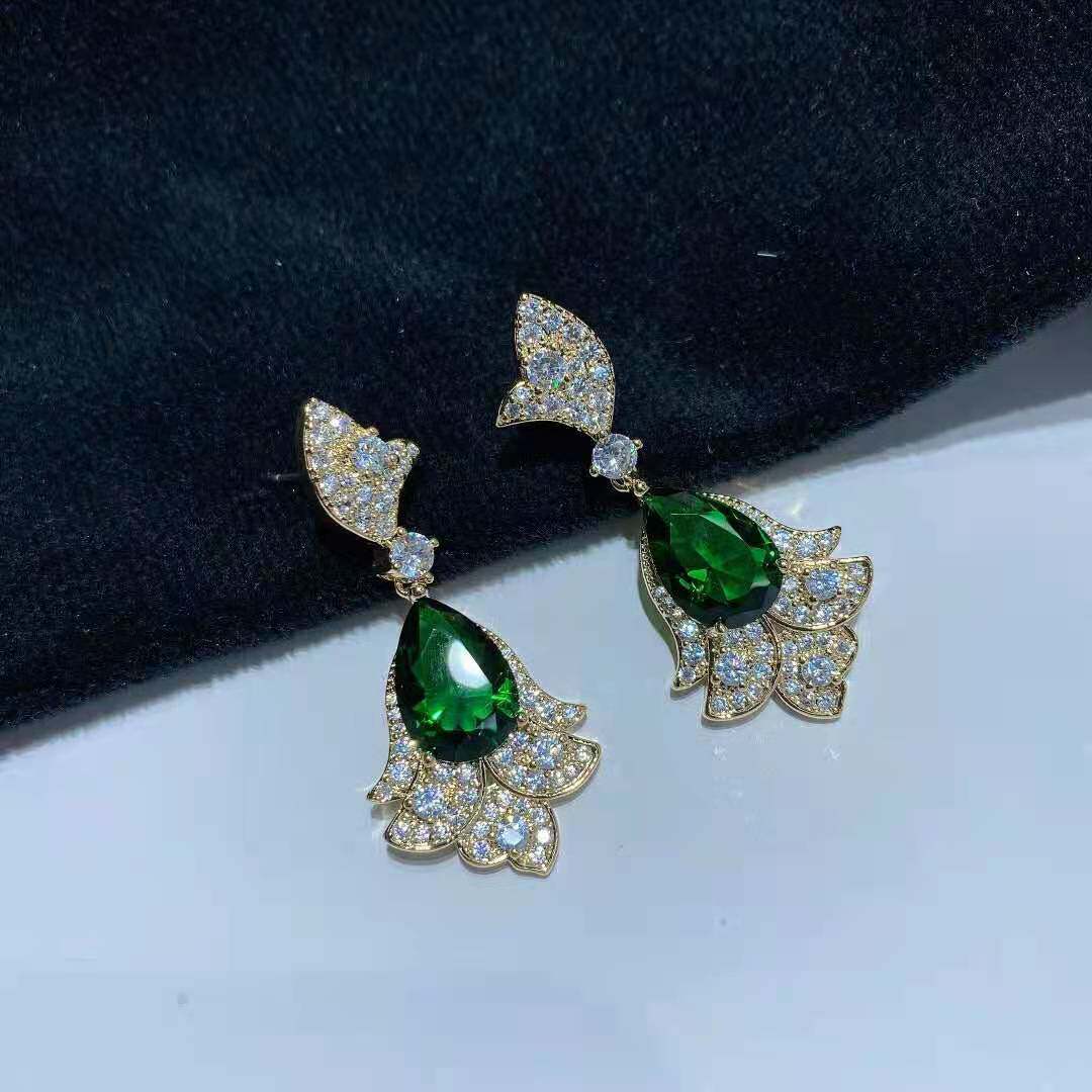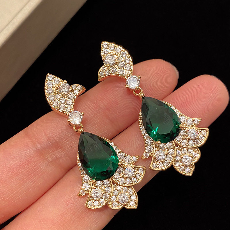 📚 925银针款祖母绿宝石水晶耳环蝴蝶水滴形欧美夸张镶钻耳环女耳钉