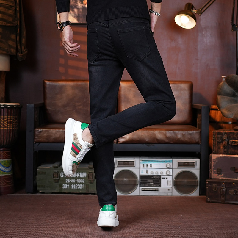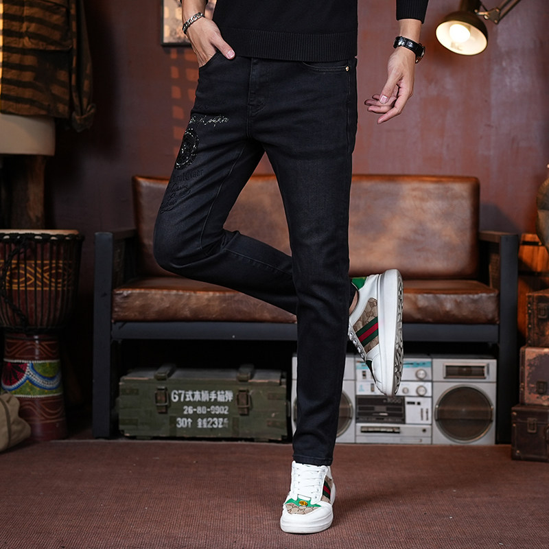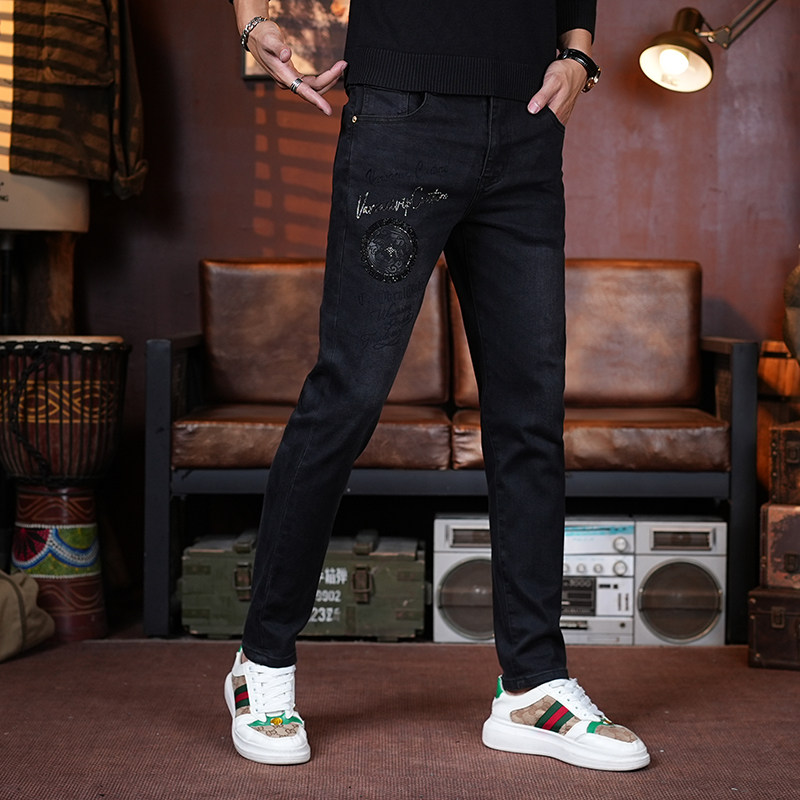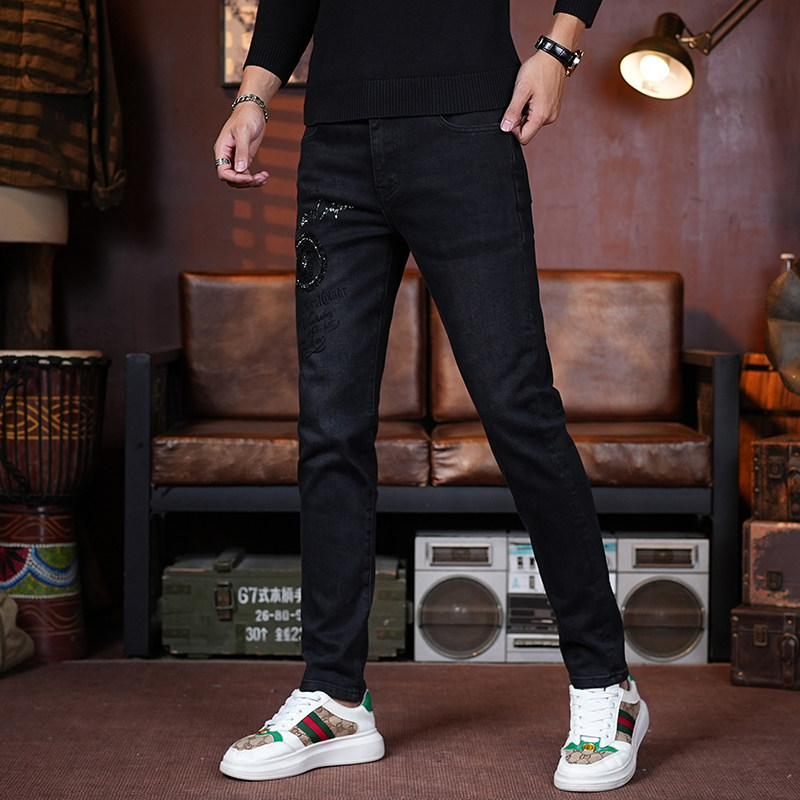 📚 欧货高端烫钻黑色牛仔裤男秋冬季修身小脚潮牌弹力百搭休闲长裤子