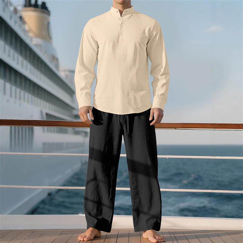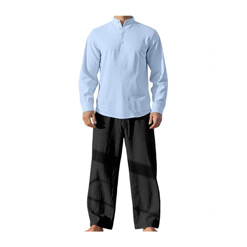 📚 2026跨境欧美春秋季薄款长袖衬衫休闲运动立领棉麻纯色衬衣男套装