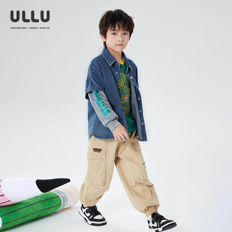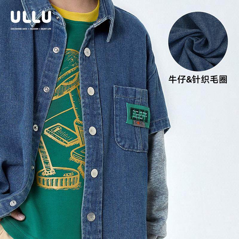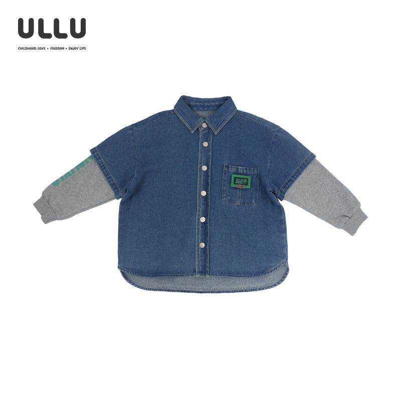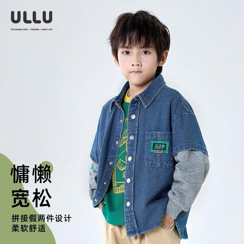 📚 ULLU优露童装男童长袖衬衫25春款复古字母印花假两件拼接牛仔衬衫