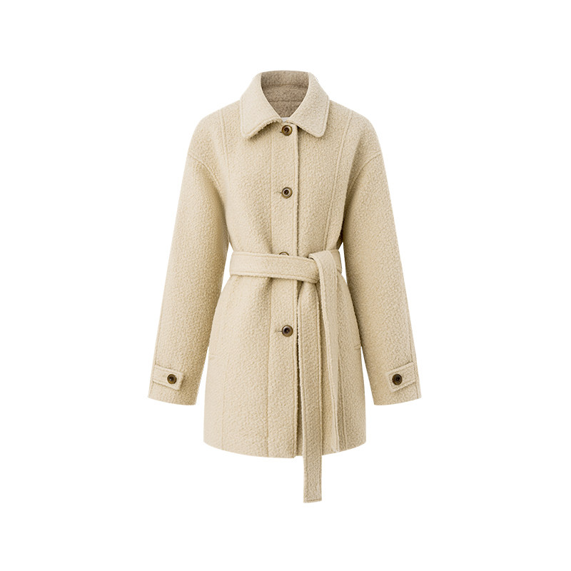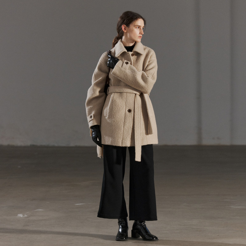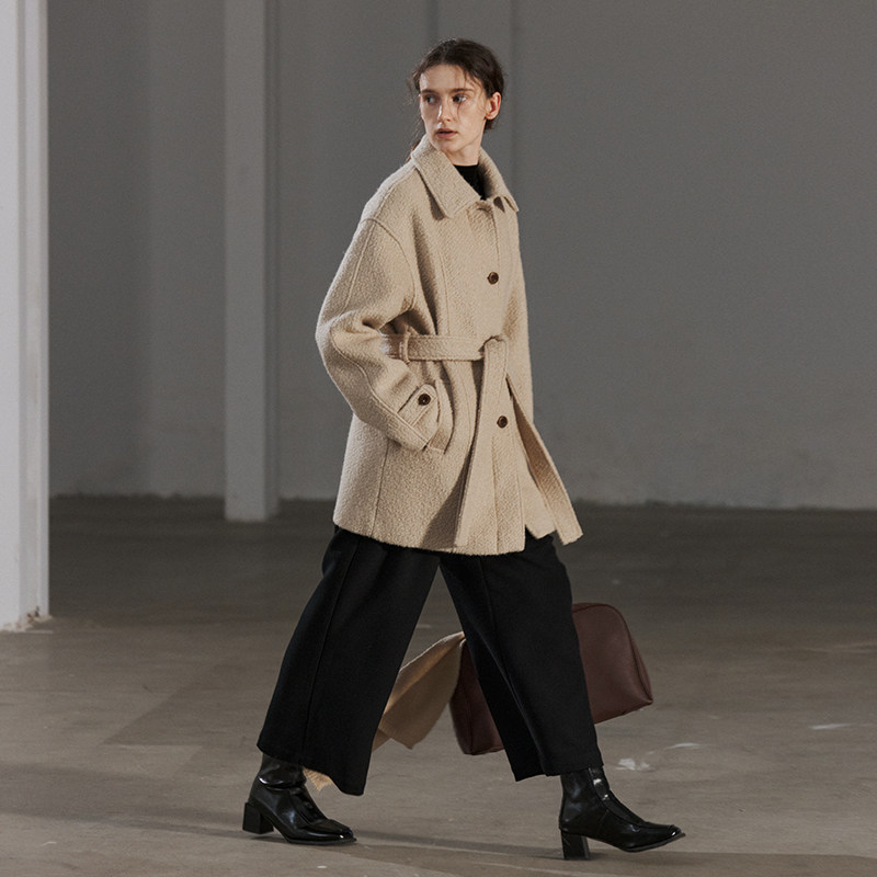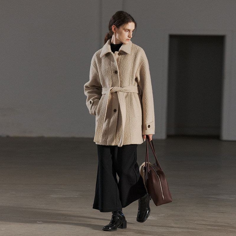 📚 NON RESTRAIN中长款圈圈羊毛混纺呢大衣女绑带翻领落肩袖毛呢外套