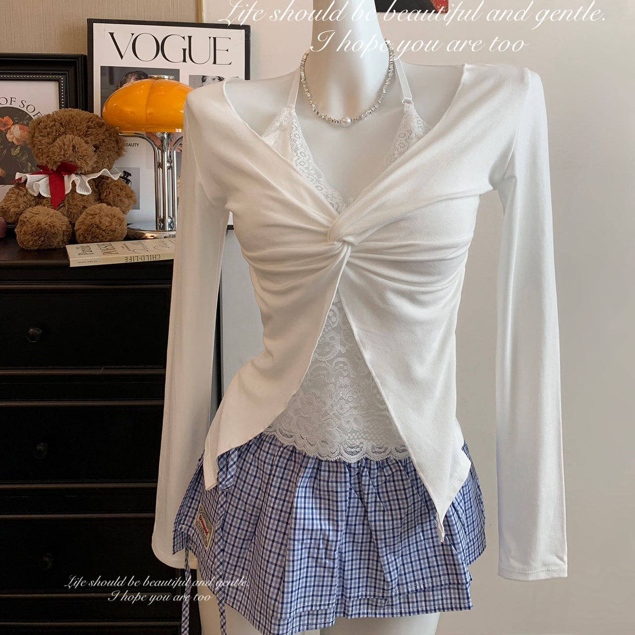 📚 纯欲风性感辣妹蕾丝假两件扭结长袖T恤女内搭外穿带胸垫百搭上衣