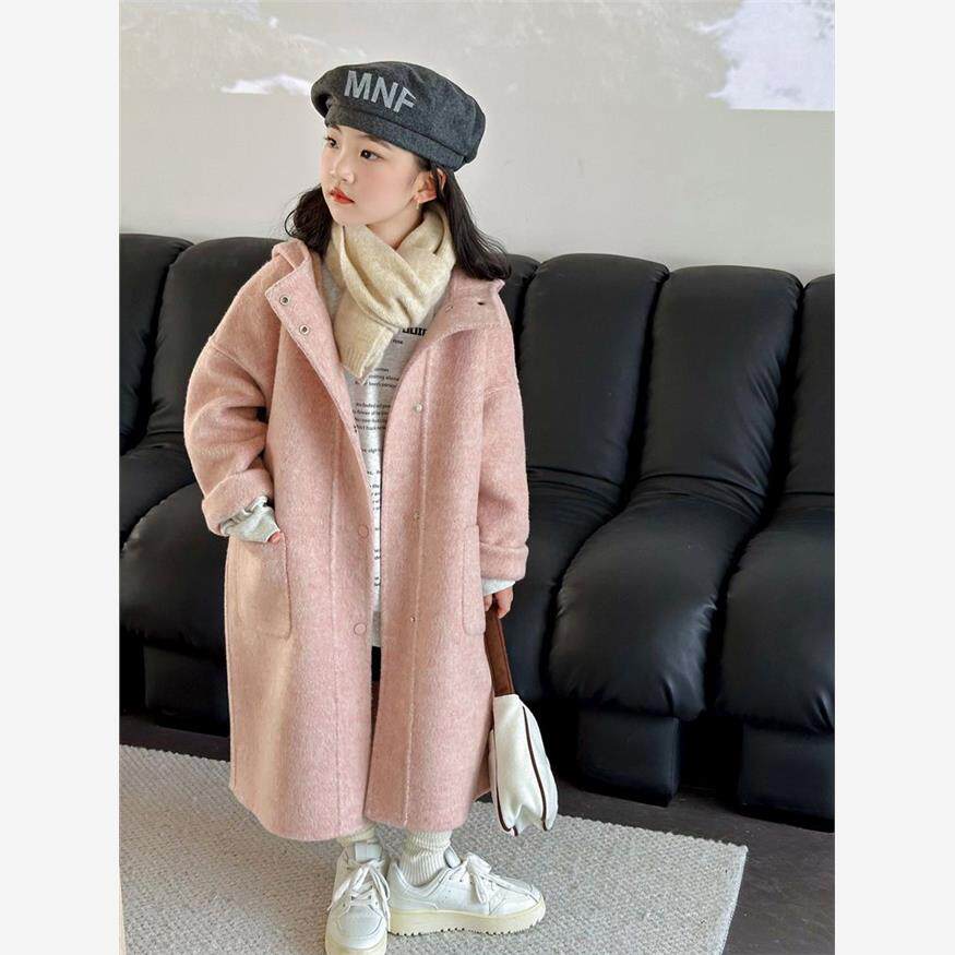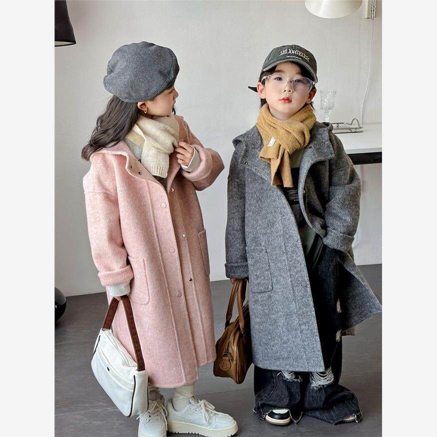 📚 韩国童装新款男女童双面毛呢大衣儿童中大童中长款连帽时髦外套潮