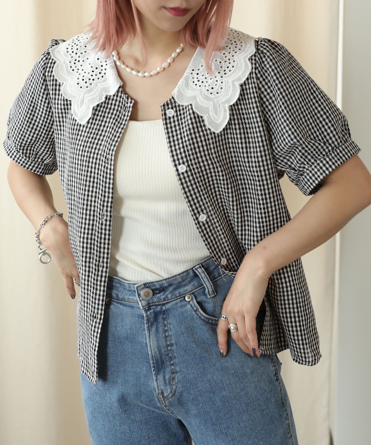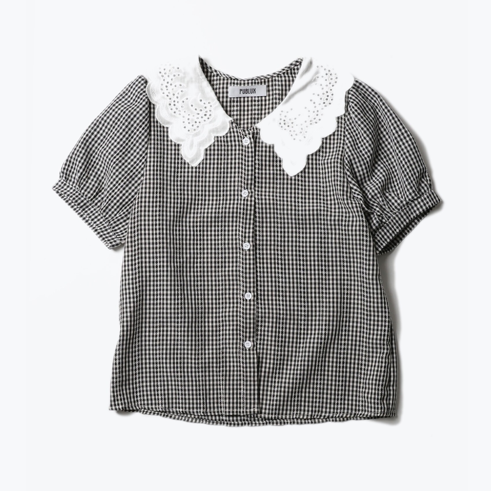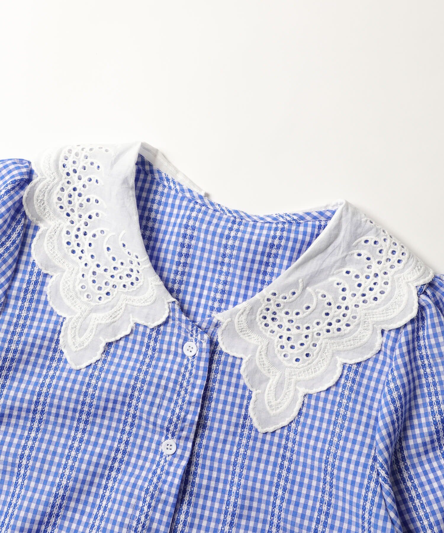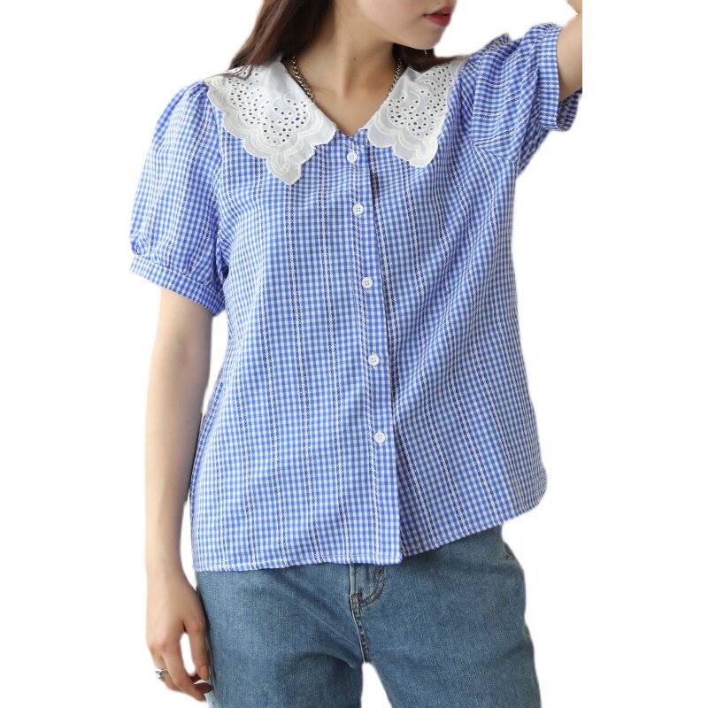 📚 蓝格子复古刺绣小花线甜美蕾丝花边领短袖衬衫上衣日系女装
