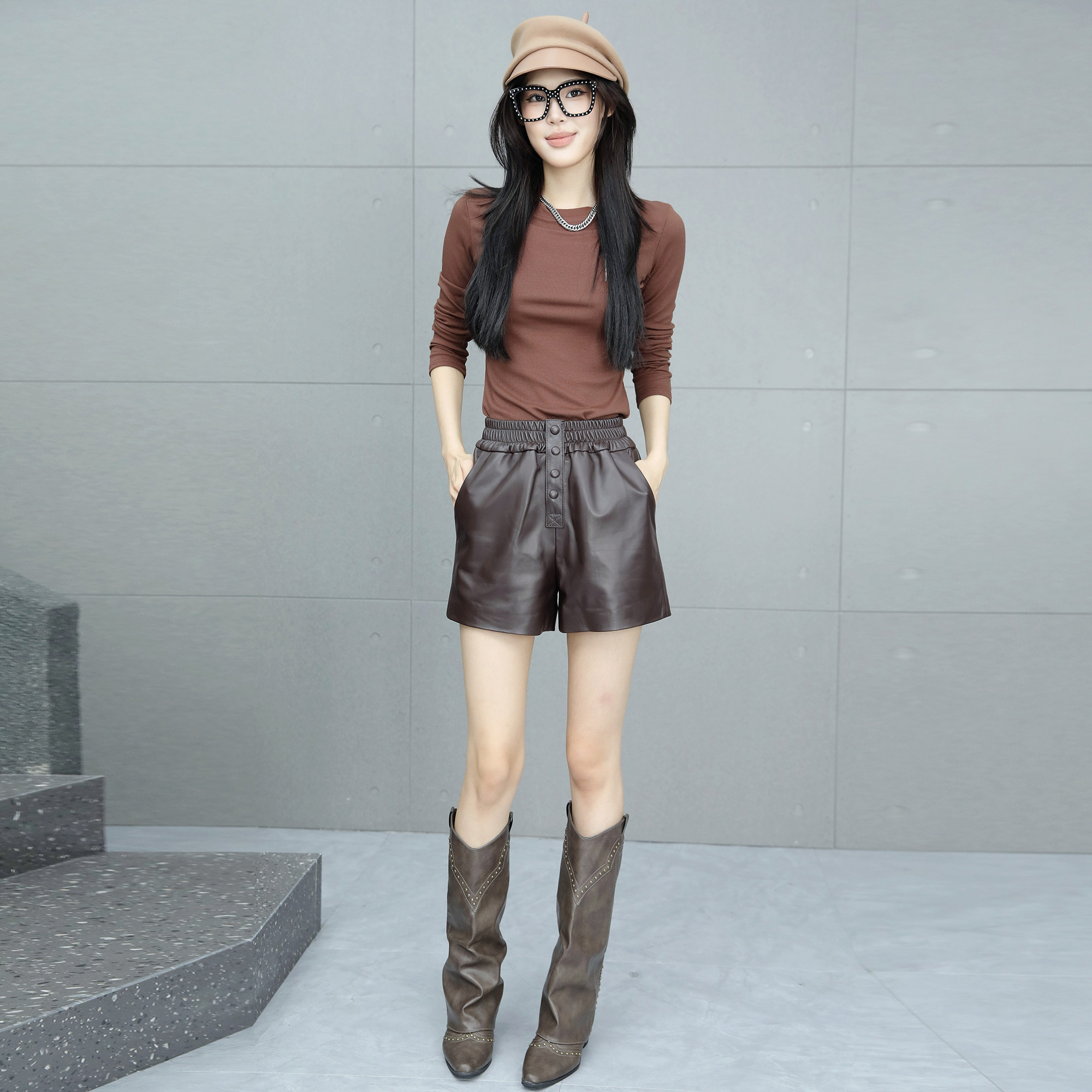 📚 真皮短裤女2025秋新款绵羊皮咖色皮裤油蜡皮阔腿裤松紧腰显瘦靴裤