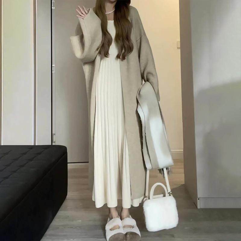 📚 白色温柔茶歇法式后妈连衣裙子女大衣内搭针织毛衣打底长裙秋冬季