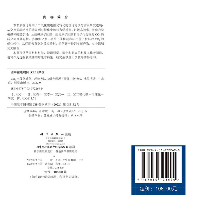 📚 正版现货 CO2电催化转化 理论方法与研究进展 孙强 李亚伟 沈昊明 科学出版社 9787030722690
