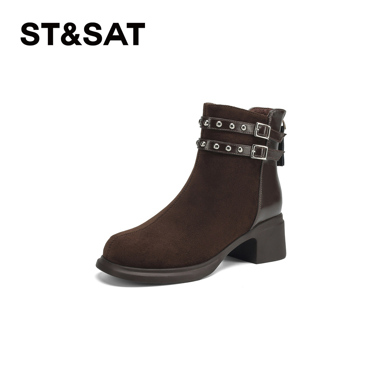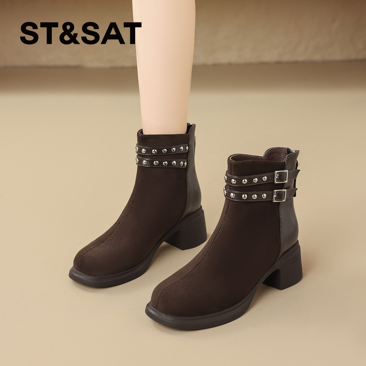 📚 星期六法式真皮棕色靴子女2025新款厚底绒面增高粗跟短靴切尔西靴