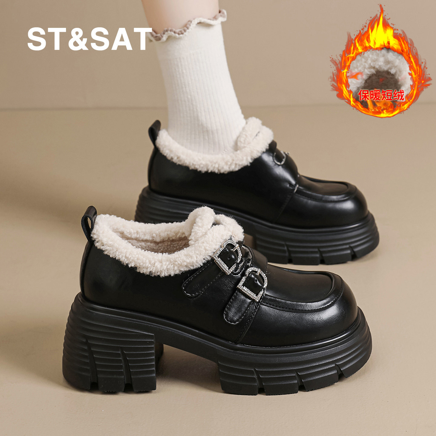 📚 星期六厚底乐福鞋女2025新款冬季加绒保暖毛毛棉鞋增高黑色小皮鞋