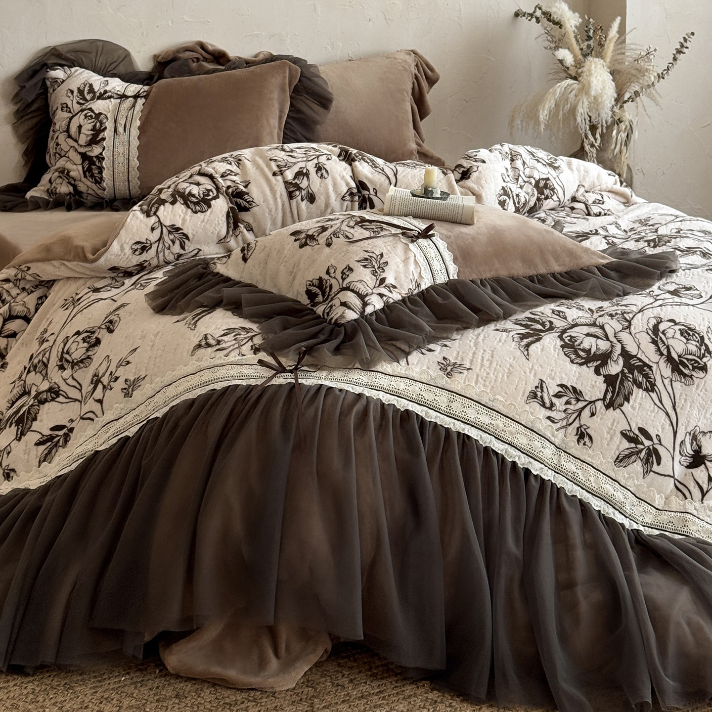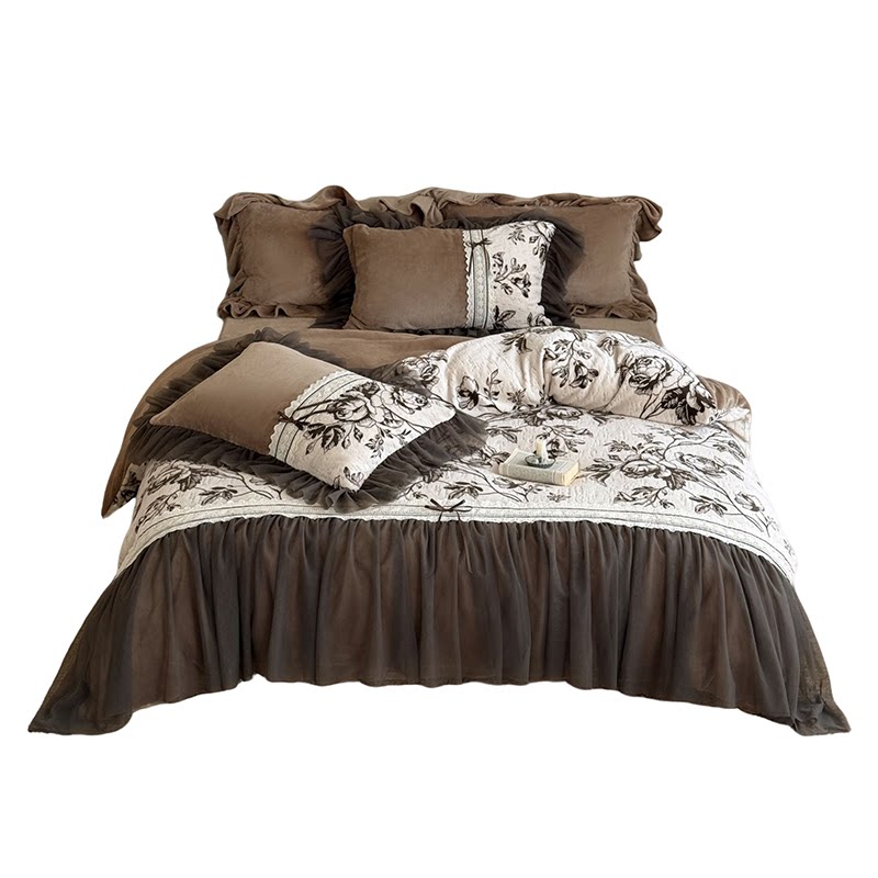 📚 法式秋冬复古牛奶绒四件套加厚保暖双面毛绒蕾丝花边被套床单床品