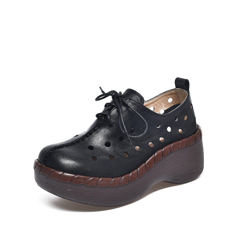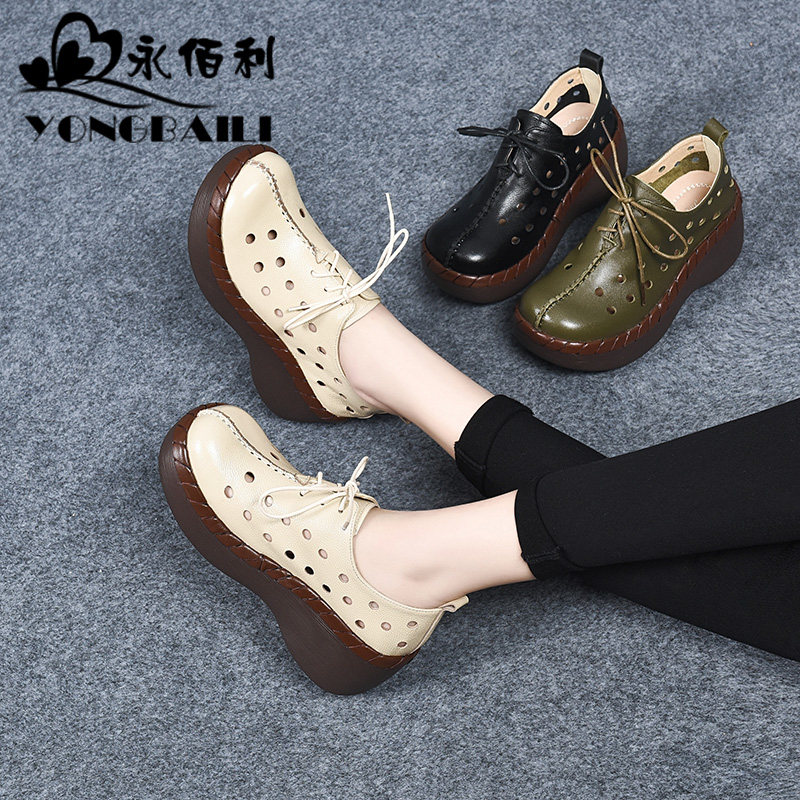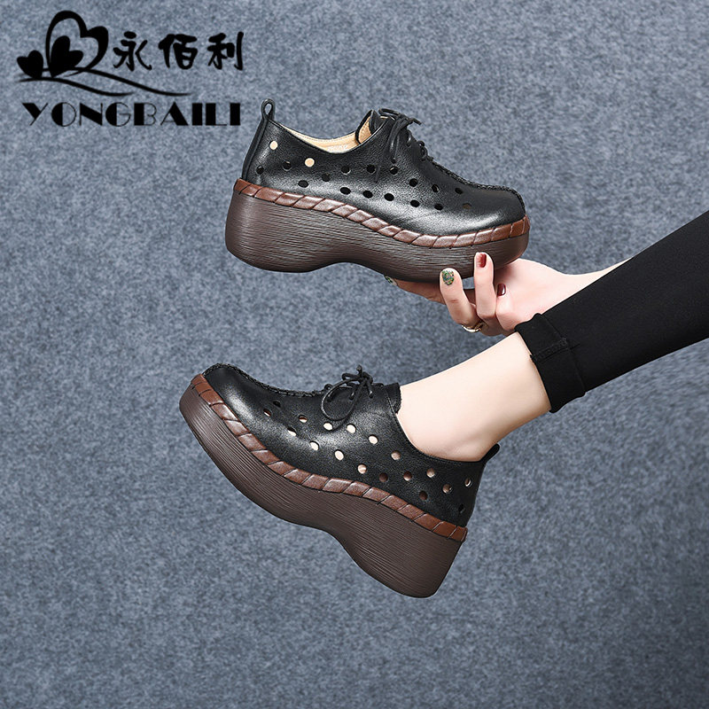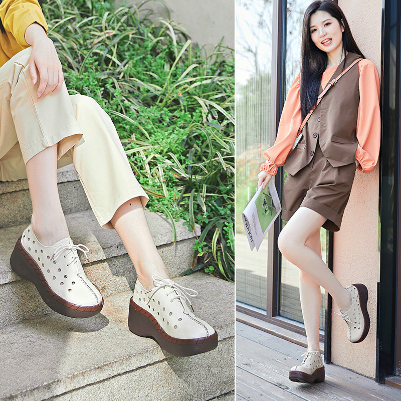 📚 真皮镂空厚底系带圆头女鞋春秋新款高跟松糕底牛皮单鞋透气皮鞋