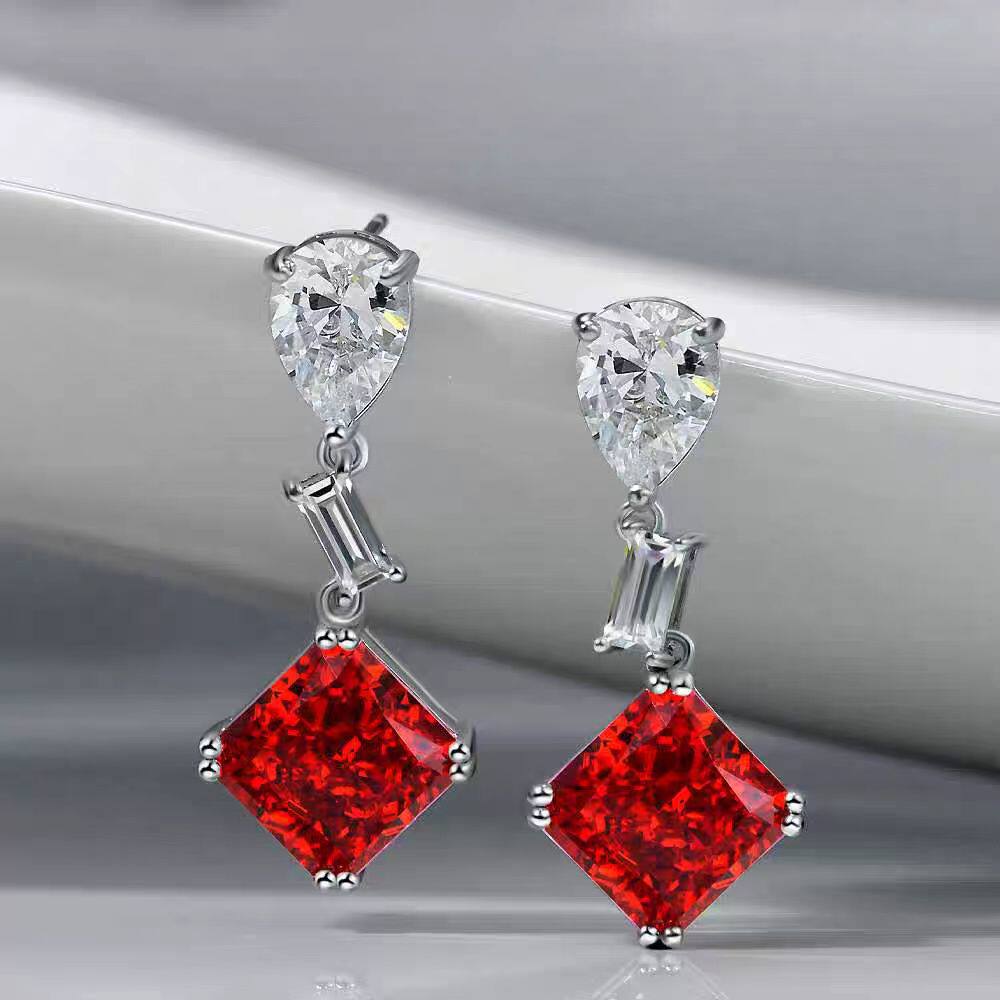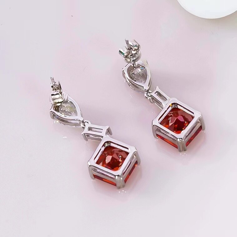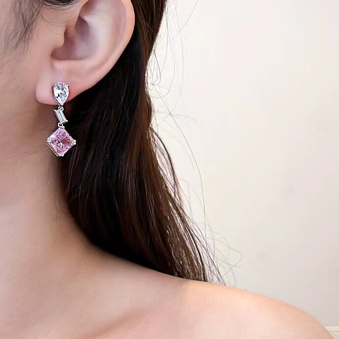 📚 18K白金莫桑石水滴方形红粉钻长款耳坠纯银设计感显瘦小众时尚女